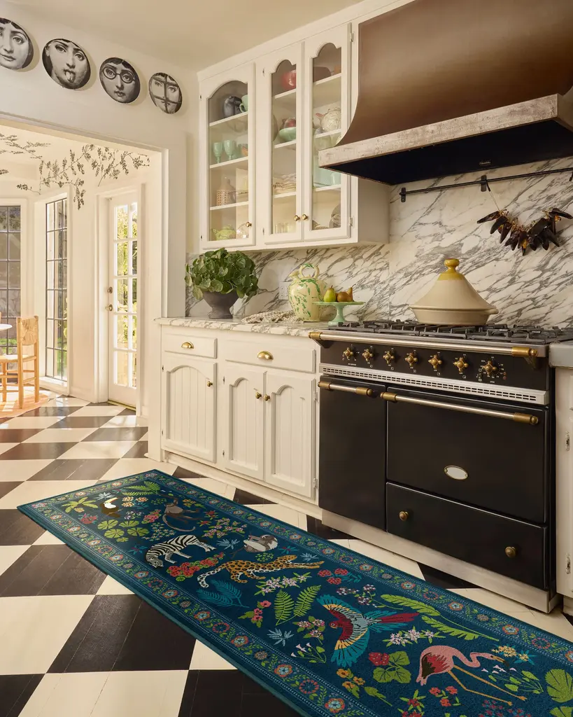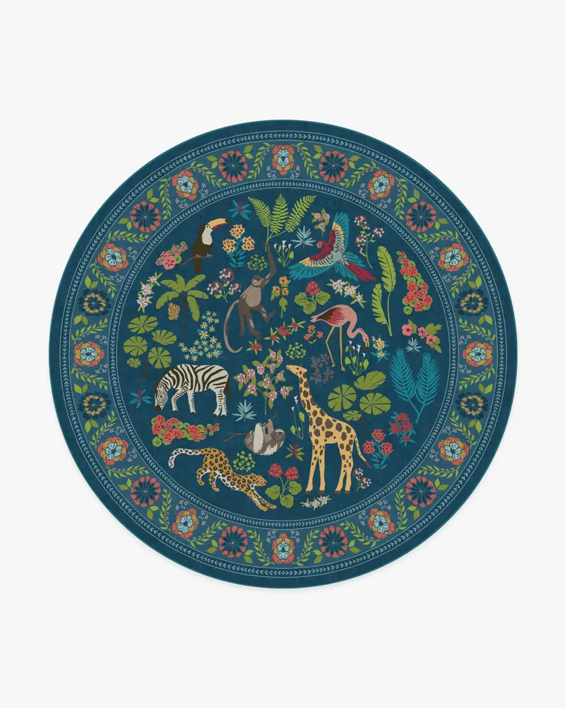 Dare to be iconic with our Iris Apfel Jingle Jungle Royal Blue Rug. Inspired by Iris' adventurous spirit, this wildlife-filled design features exotic animals roaming among lush foliage. A vivid color palette with splashes of yellow, bright blue, green, cool pink, and beige pops against a royal blue background. Water-resistant, stain-resistant, and machine-washable. Rug colors may vary slightly according to your device and the lighting in your space.