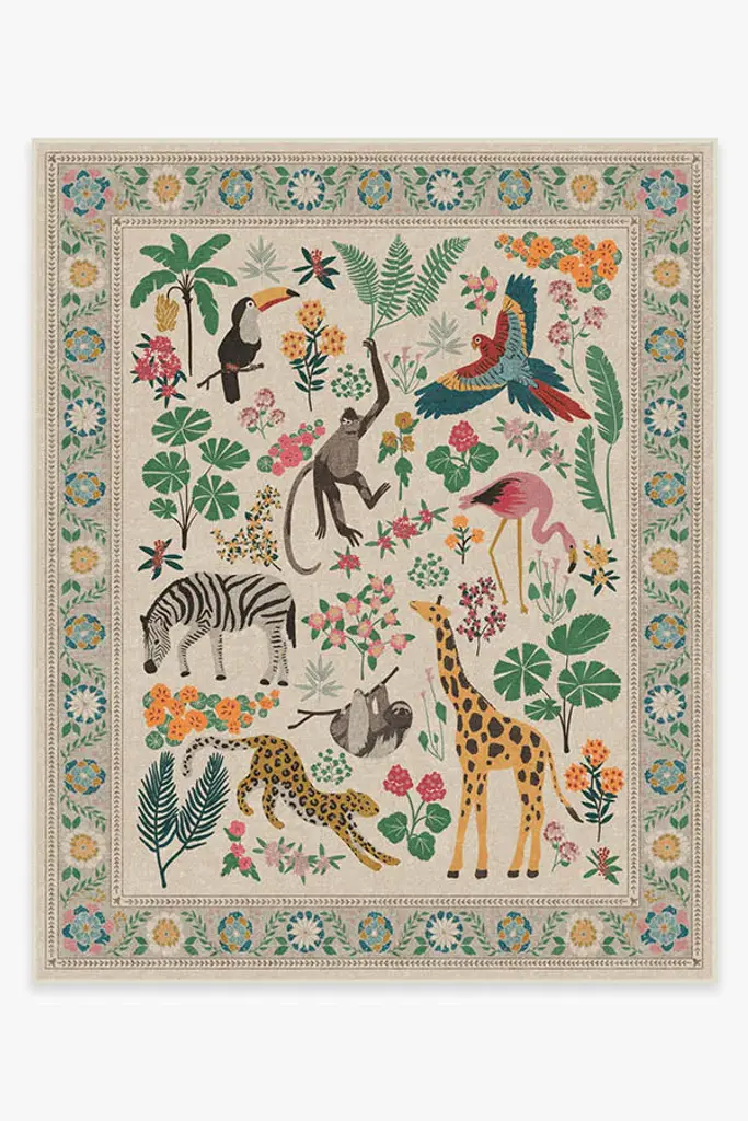 Take a walk on the wild side. Our Iris Apfel Jingle Jungle Rug draws inspiration from the fashion icon's love of animal figurines she's collected on her travels. This lively design features a delightful assortment of animals - monkeys, sloths, giraffes, zebras, and more - surrounded by tropical flora. The bold and bright color palette is contrasted against a neutral background that allows the motifs to stand out to the eye. Made from our water-resistant, stain-resistant, and machine-washable low-pile Chenille material.