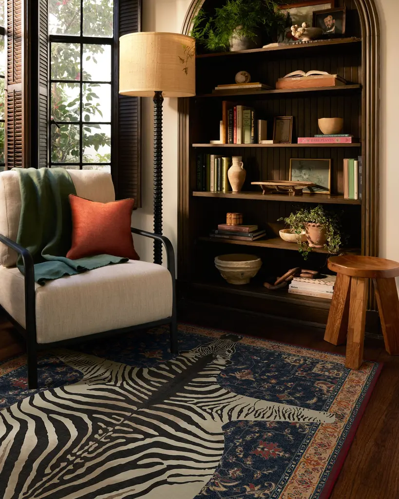 Dare to be different. Our Iris Apfel On Safari Sapphire Rug features an intricate Persian-inspired design layered with large animal imagery for a sense of sophisticated eclecticism. The bold royal blues and rich reds of the detailed background are reminiscent of traditional home colors, which stand out against the colors of the black and white zebra. Water-resistant, stain-resistant, and machine-washable.