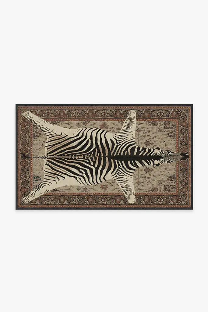 Dare to be different. Our Iris Apfel On Safari Sapphire Rug features an intricate Persian-inspired design layered with large animal imagery for a sense of sophisticated eclecticism. The bold royal blues and rich reds of the detailed background are reminiscent of traditional home colors, which stand out against the colors of the black and white zebra. Water-resistant, stain-resistant, and machine-washable.