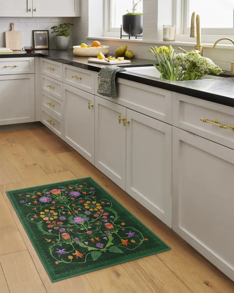 BACK BY POPULAR DEMAND: Celebrate a lasting legacy with our Limited Edition Iris Apfel Protea Forest Green Rug. Inspired by floral fabrics from Iris' own collection, this botanical design features vivid, mirrored floral motifs that attract the sweetest hummingbirds in a garden-like setting. Petals in bright yellow, lavender, pink, and red bloom beautifully against a deep green background. Water-resistant, stain-resistant, and machine-washable. Rug colors may vary slightly according to your device and the lighting in your space.