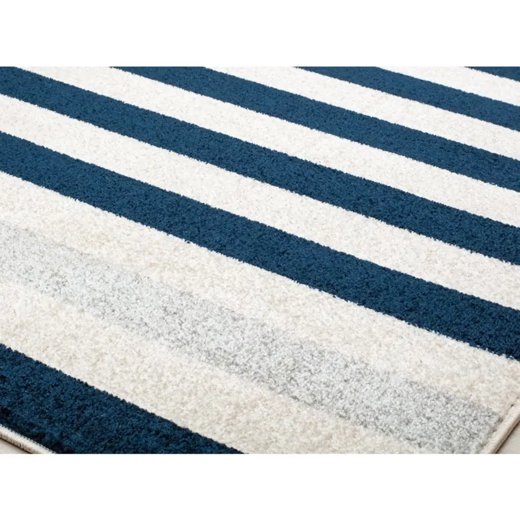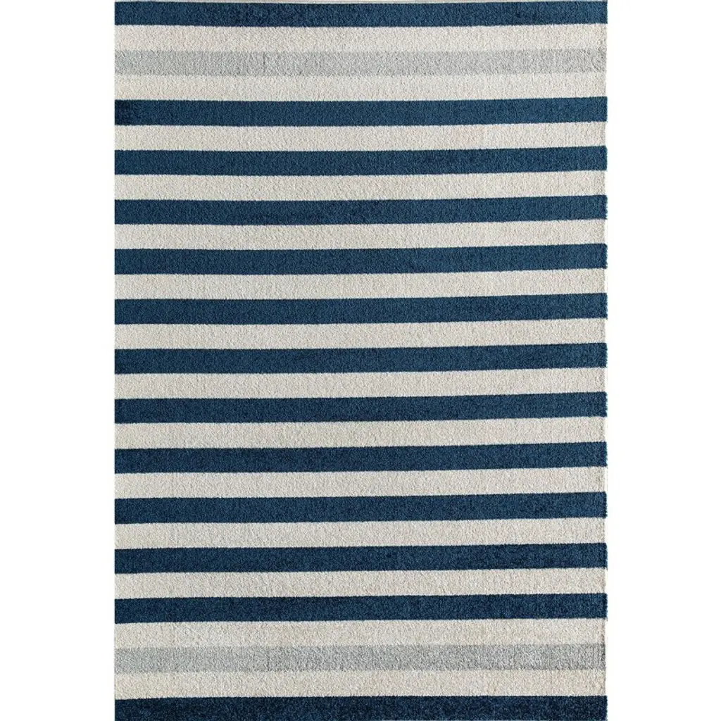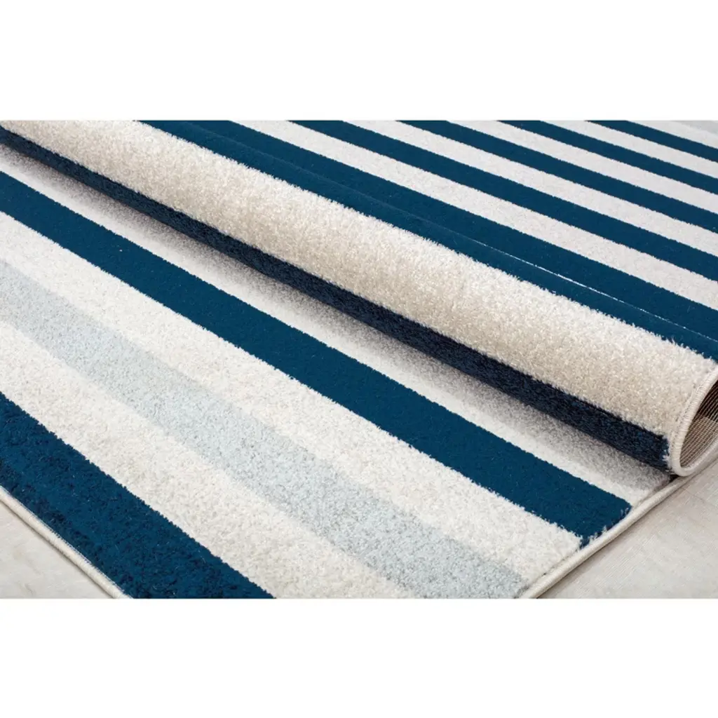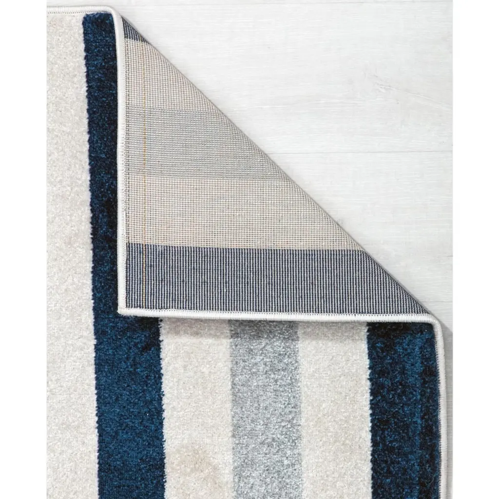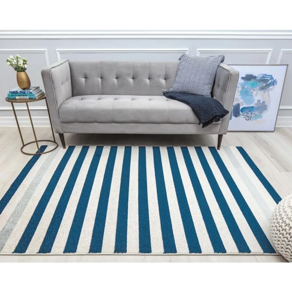 How about a beach day– every day! Sounds good? This navy ocean blue area rug compliments a bright room well, and a durable rug with a confident design is sure to be a welcome mainstay in your home. Solid striped patterns with complementing shades and tints of blue give a gorgeous modern look with long-wearing elegance you just can’t pass up. Recreate sunny days in the waves through admiring this area rug’s color clarity without the sand rash! This stunning area rug is part of a collection designed in collaboration with renowned fashion designer Isaac Mizrahi.