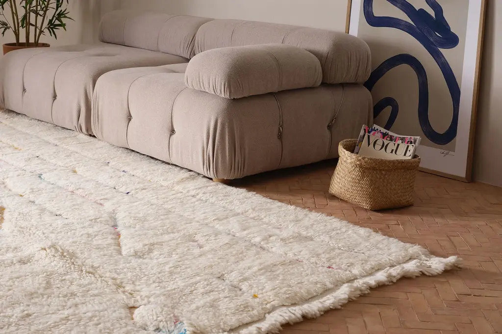 Our Moroccan pieces are each one-of-a-kind. Much of our collection was woven between 30 and 100 years ago, and curated by us. Other rugs in our collection are fresh off the loom and made with traditional techniques. Moroccan rugs don’t come with a key. As with any painting or poem, their motifs have many subjective interpretations. Originally made for personal use, these rugs took months to weave, documenting a shifting tide of events and emotions in the weaver’s life.