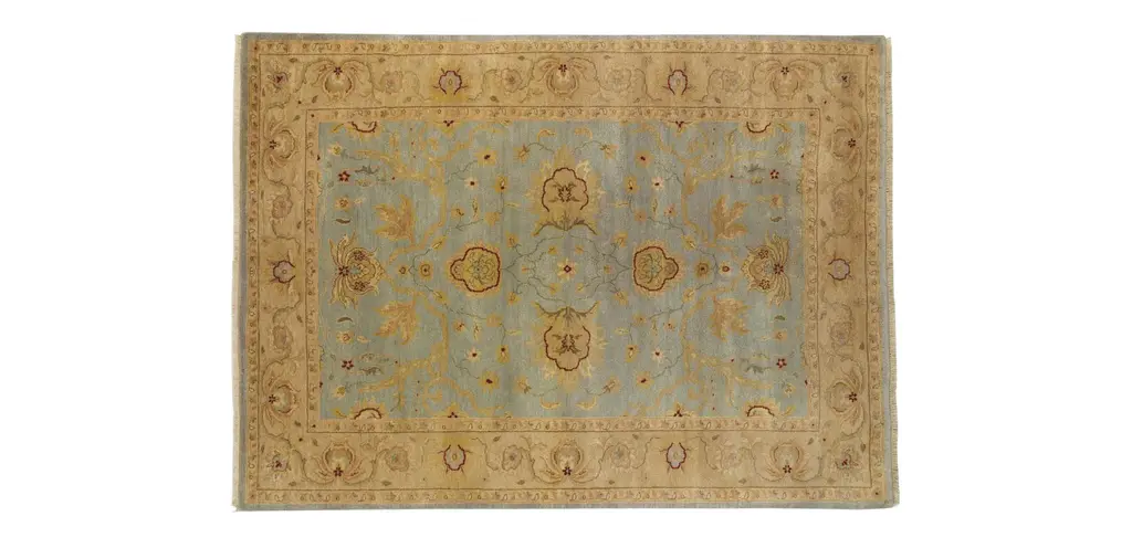 The new neutral. This mineral blue, ivory, and tan piece is injected with punches of cranberry for a modern nod to the palettes of antique heirloom rugs, in which one color remains remarkably strong while the rest have faded. The yarns are a blend of Indian and New Zealand wools, spun first by hand and then hard-twisted. Washed two times with an antique wash, to increase the rug’s hand, luster, and aged appearance.
