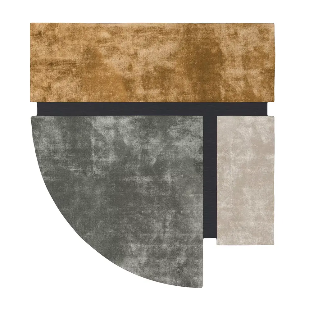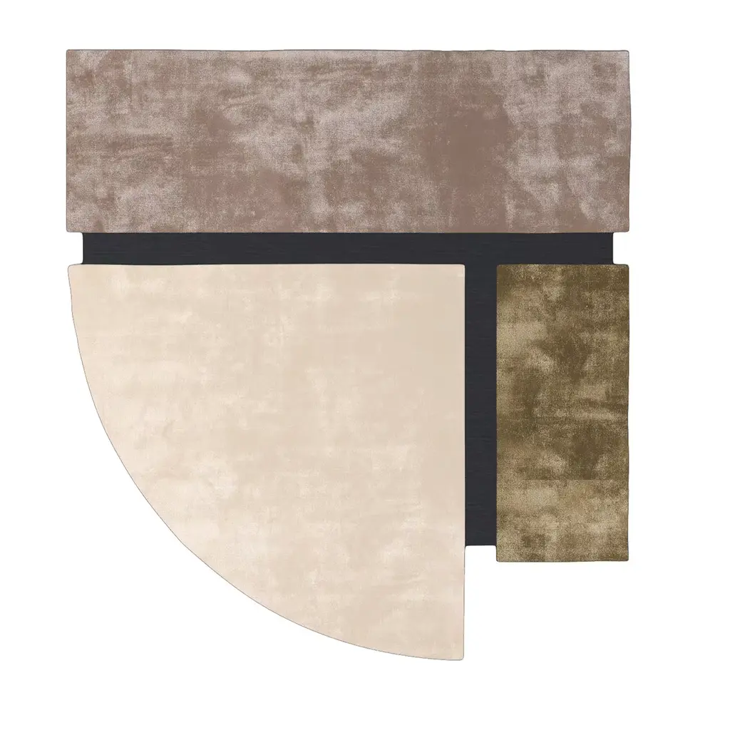 Hand-tufted in India, this rug combines artisanal methods with a modern, standout design. Its unique silhouette is defined by a combination of rounded and right-angled geometric segments in sandy neutrals. Cotton warp and weft with pile made from bamboo fiber. Pile height: approx. 15-18 mm. Dimensions can be customized on request.