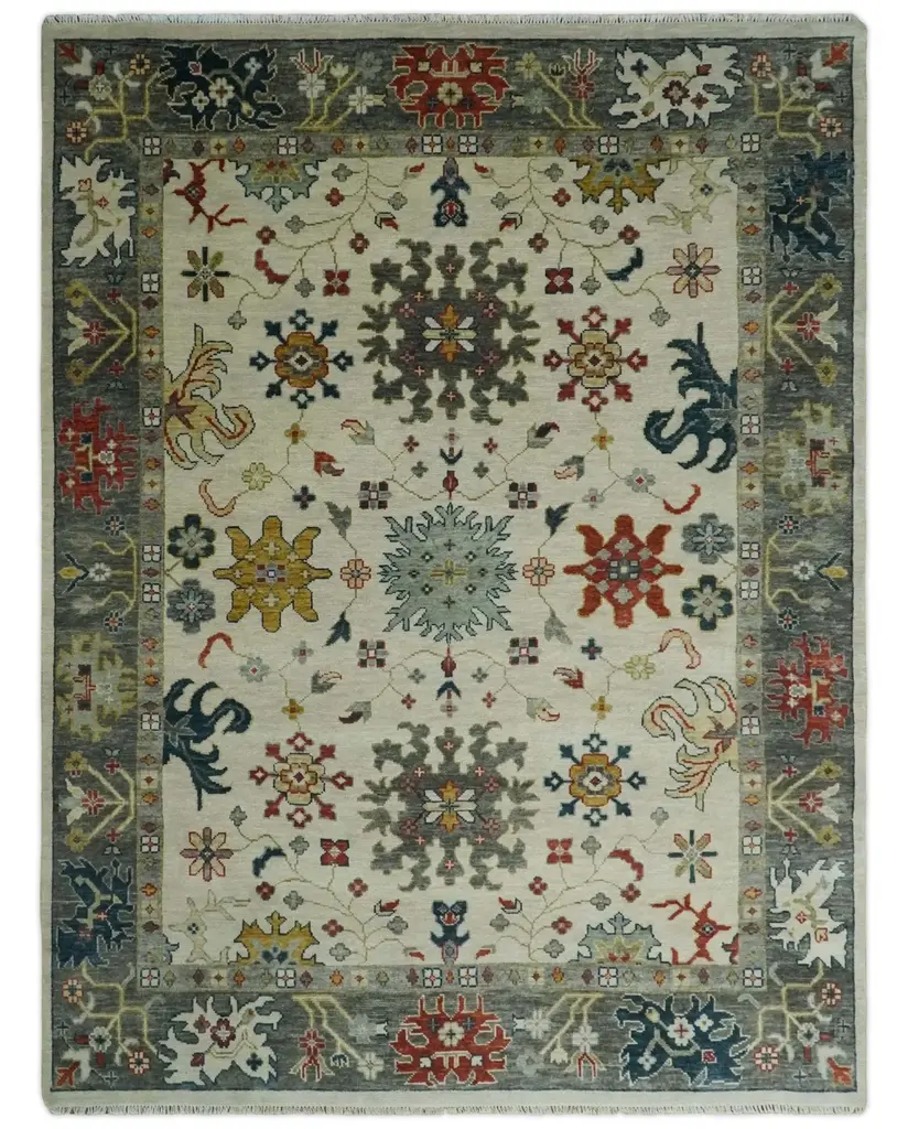 Ivory And Gray Floral Oushak Hand Knotted Custom Made Wool Area Rug - 2.6x8