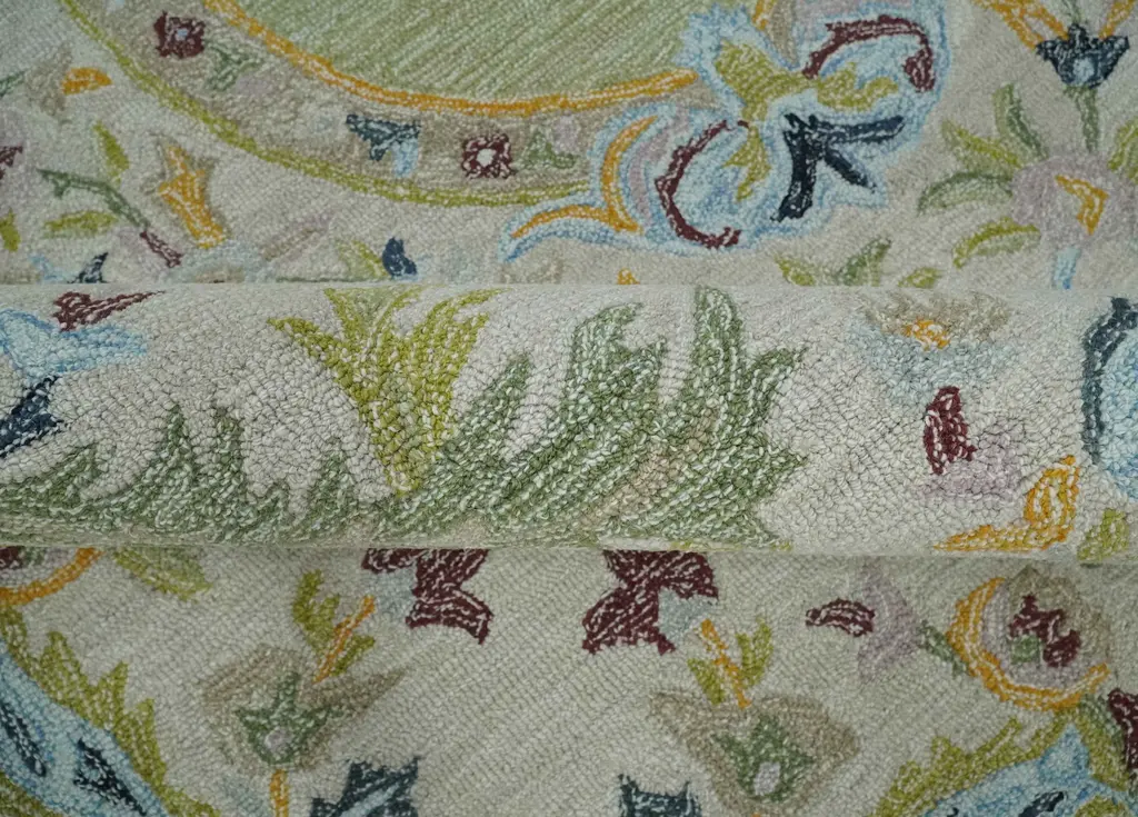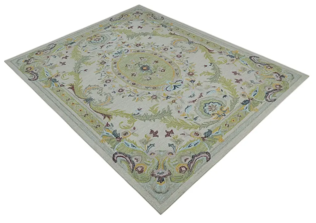 Ivory And Green Custom Made French Design Aubusson Hand Tufted Wool Area Rug - 2.6x14