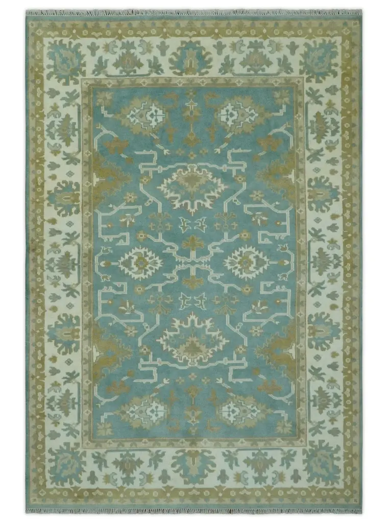 Expertly handcrafted with premium wool, this custom-made ivory and teal traditional Oriental Oushak rug features intricate hand-knotted designs for a timeless and luxurious addition to any space. Add warmth, elegance, and durability to your home with this one-of-a-kind piece. Hand-Knotted Made with Wool Made to Order in 30-45 Days Color: Ivory and Teal Made with 28 knots per square inch USERS GUIDE Avoid prolonged moisture Vacuum regularly and/or shake to remove dust Do not pull any loose threads. Use scissors to simply cut the ends The blot spills immediately with a white cloth. Harsh chemicals may damage or fade the rug Use rug protectors under heavy furniture