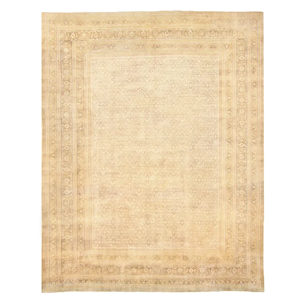 This Large Antique Persian Tabriz Rug - 13'7" x 16'7" has a decorative, soft neutral coloration combined with an all-over design that is sure to catch the eye. This one-of-a-kind rug was hand-knotted with durable wool in Persia at the turn of the twentieth century. This particular antique Persian rug features an intriguing monochromatic design making it a lovely addition to traditional, transitional, and bohemian homes.