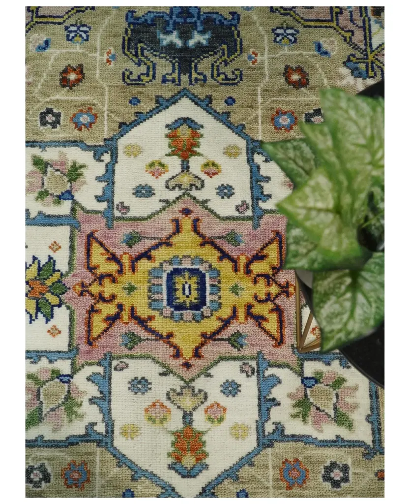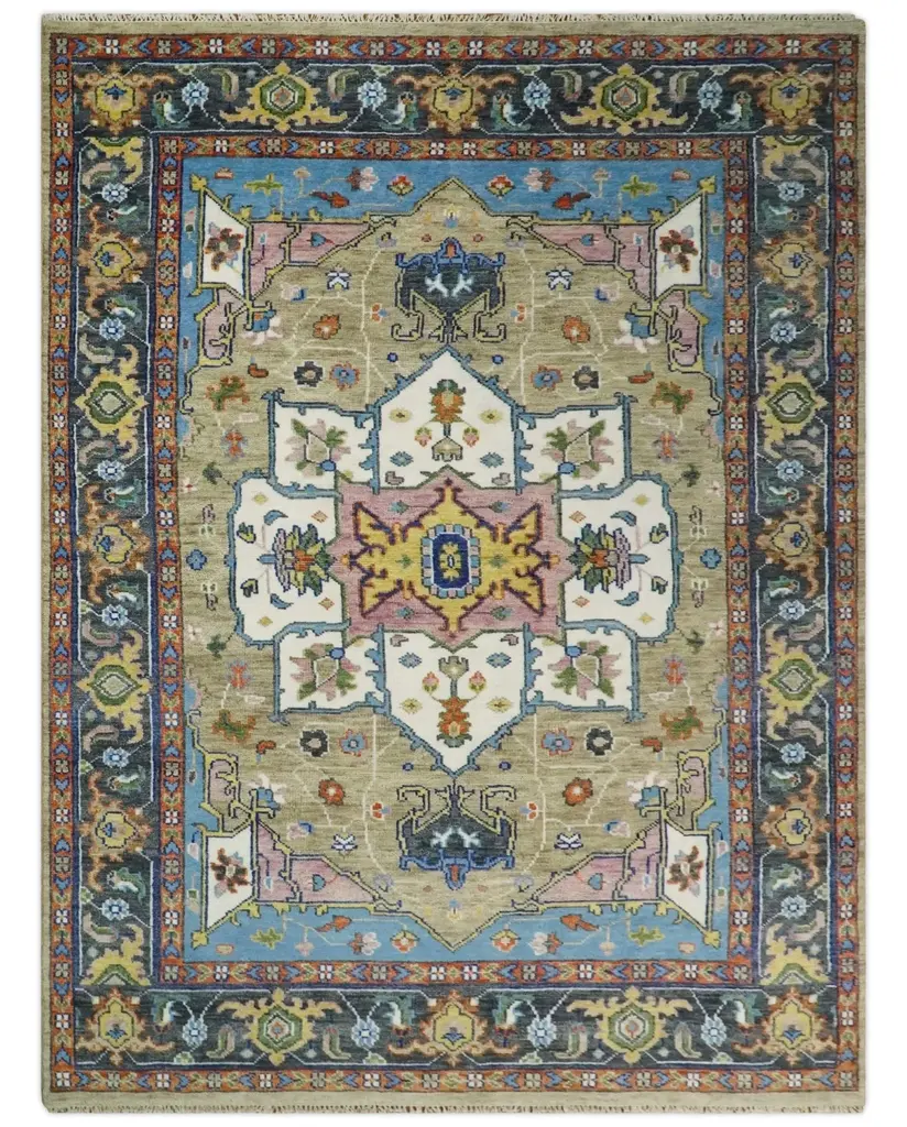 This expertly hand-knotted Traditional Heriz Area Rug features a captivating blend of ivory, beige, blue, and charcoal colors. Made from premium wool, it offers both durability and softness for a luxurious addition to any space. Available in various sizes, it adds a timeless touch to your decor. Hand-Knotted Rug Made with Wool Color: Ivory, Beige, Blue and Charcoal Made with 22 knots per square inch All sizes are made to order in 30-45 days This specific rug is made in India, in the city of Bhadohi. Bhadohi is one of the biggest rug manufacturing cities. Carpet weaving in the region dates back to the 16th century during the reign of Akbar. The skilled artisans of Bhadohi have been carrying the tradition of rug-making for centuries. USERS GUIDE Avoid prolonged moisture Vacuum regularly and/or shake to remove dust Do not pull any loose threads. Use scissors to simply cut the ends Blot spills immediately with a white cloth. Harsh chemicals may damage or fade the rug Use rug protectors under heavy furniture