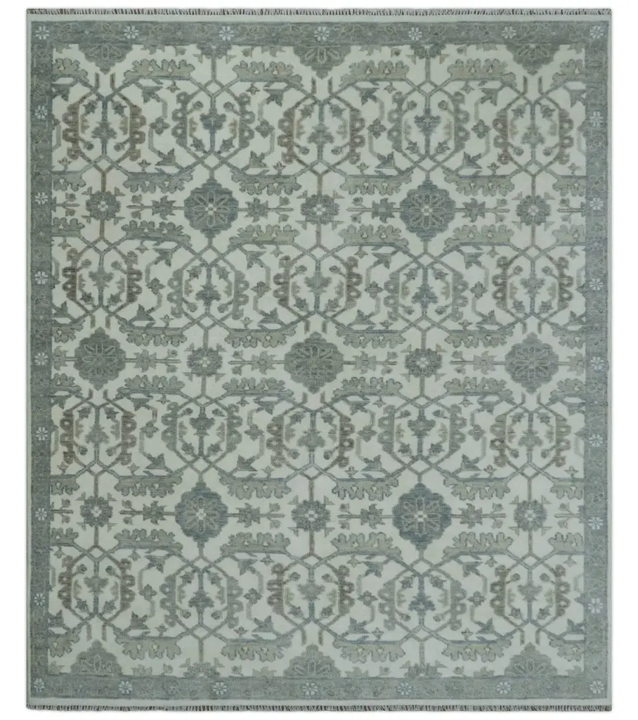 This classic Ivory, Blue and Beige hand knotted traditional wool rug showcases a large, intricate design in multiple sizes. Crafted with high-quality wool, this rug offers both timeless elegance and durability. Add a touch of sophistication to your home with this luxurious statement piece. Hand-knotted wool rug Made to order 30-45 Days Made with fine Hand-spun Wool Color: Ivory, Blue and Beige Sizes are made to order 30-60 days Oushak or Ushak rugs are Turkish rugs that use a particular family of designs. Oushak rug's origin can be traced back to the Ottoman empire. Oushak rugs are evergreen rugs. A lot of Oushak rugs are machine-made now, but we have carried this legacy forward in India. Our Oushak rugs are handmade with fine imported wool in Bhadohi, which is one of the biggest rug manufacturing cities. Carpet weaving in the region dates back to the 16th century during the reign of Akbar. The skilled artisans of Bhadohi have been carrying the tradition of rug-making for centuries.USERS GUIDE Avoid prolonged moisture Vacuum regularly and/or shake to remove dust Do not pull any loose threads. Use scissors to simply cut the ends Blot spills immediately with a white cloth. Harsh chemicals may damage or fade the rug Use rug protectors under heavy furniture
