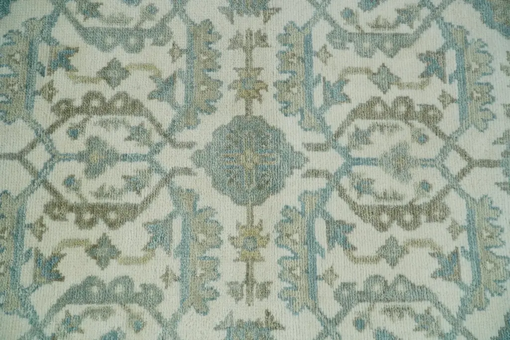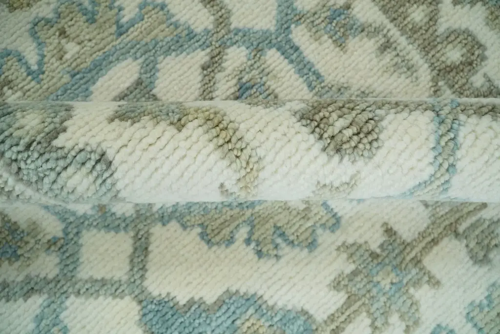 This classic Ivory, Blue and Beige hand knotted traditional wool rug showcases a large, intricate design in multiple sizes. Crafted with high-quality wool, this rug offers both timeless elegance and durability. Add a touch of sophistication to your home with this luxurious statement piece. Hand-knotted wool rug Made to order 30-45 Days Made with fine Hand-spun Wool Color: Ivory, Blue and Beige Sizes are made to order 30-60 days Oushak or Ushak rugs are Turkish rugs that use a particular family of designs. Oushak rug's origin can be traced back to the Ottoman empire. Oushak rugs are evergreen rugs. A lot of Oushak rugs are machine-made now, but we have carried this legacy forward in India. Our Oushak rugs are handmade with fine imported wool in Bhadohi, which is one of the biggest rug manufacturing cities. Carpet weaving in the region dates back to the 16th century during the reign of Akbar. The skilled artisans of Bhadohi have been carrying the tradition of rug-making for centuries.USERS GUIDE Avoid prolonged moisture Vacuum regularly and/or shake to remove dust Do not pull any loose threads. Use scissors to simply cut the ends Blot spills immediately with a white cloth. Harsh chemicals may damage or fade the rug Use rug protectors under heavy furniture