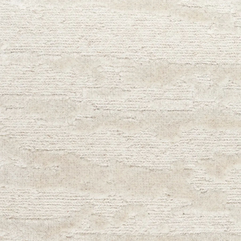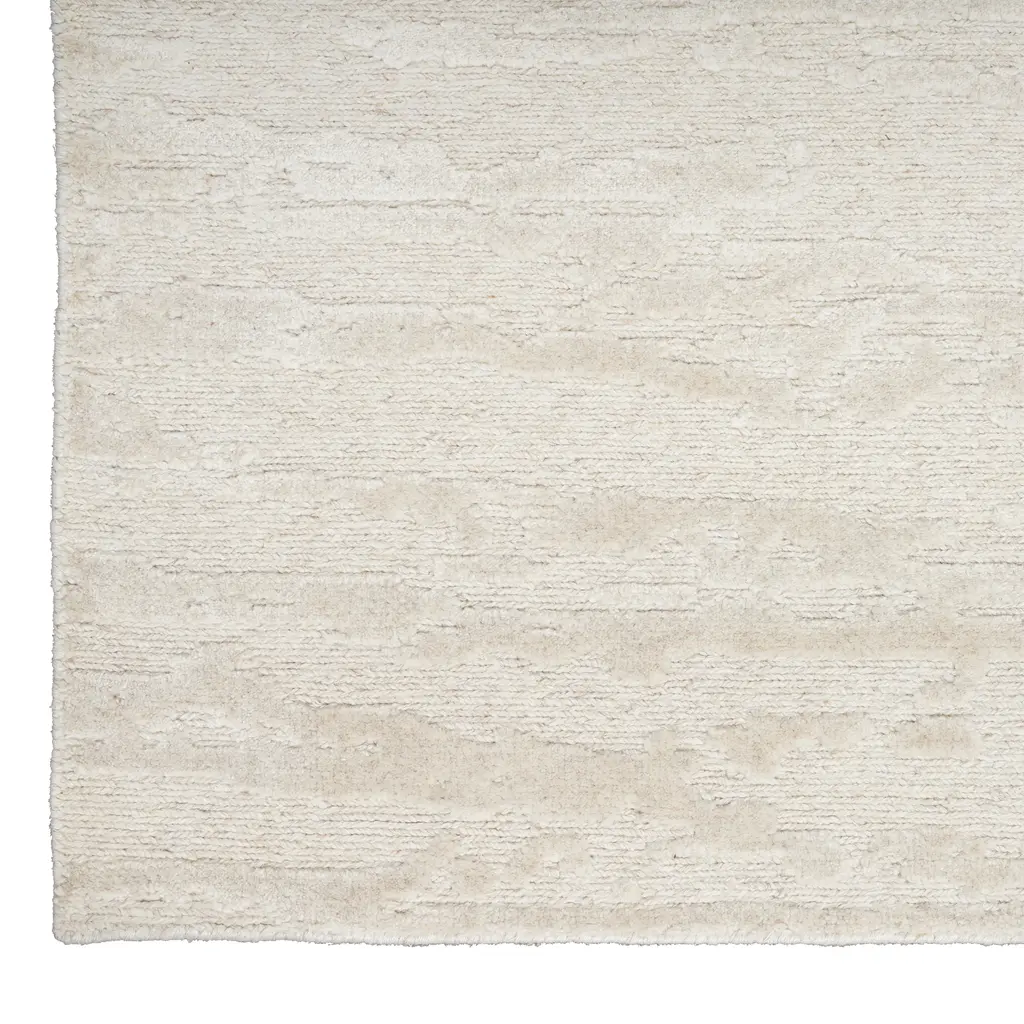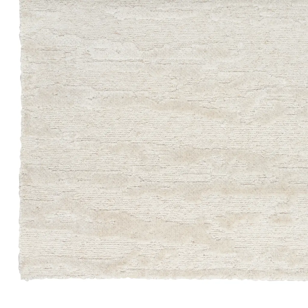 Ivory Essentials Contemporary Wool Luxcelle Blend Rug. This large area rug, part of the Essentials collection, features a neutral ivory color and a sophisticated material blend. Designed for modern living spaces, it offers both refined style and practical functionality. Crafted from 31% New Zealand Wool and 69% Luxcelle, the rug combines the natural resilience and warmth of wool with the soft sheen and texture of Luxcelle. This blend results in a surface that is durable yet soft underfoot. The rug's subtle texture, visible as slight variations in its pile, adds visual interest and depth without introducing overt patterns. With dimensions of 7'9" x 9'9", this rug is well-suited for defining areas in living rooms, dining rooms, or large bedrooms. Its contemporary design and versatile ivory hue allow it to integrate seamlessly with various interior decor styles, from minimalist to transitional. This piece is skillfully produced in India, known for its tradition of quality rug craftsmanship.