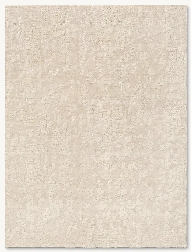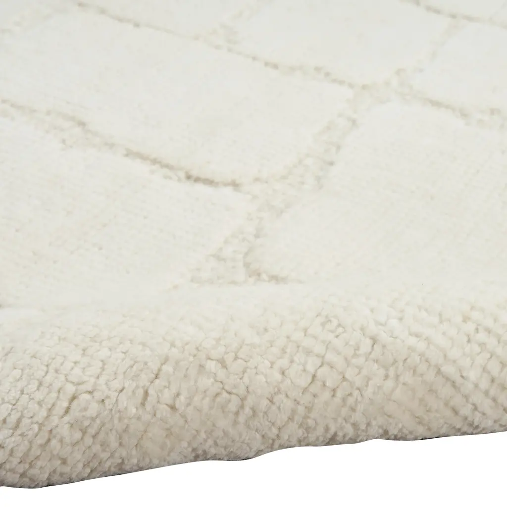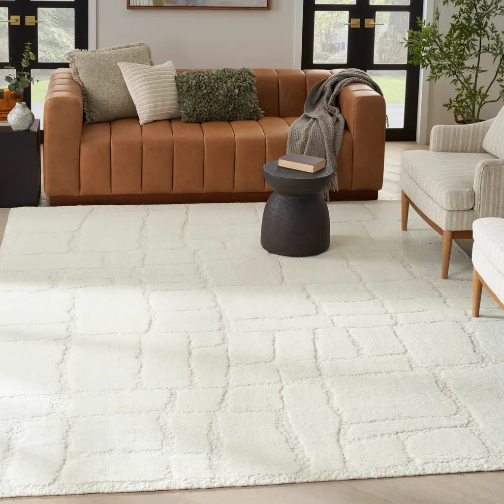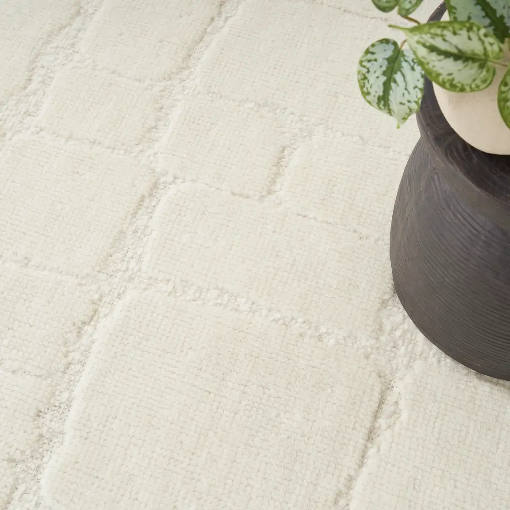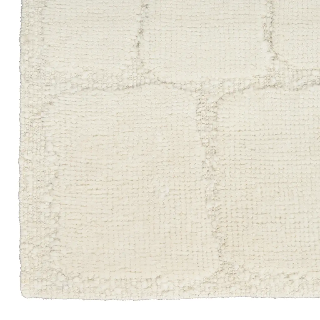 The Ivory Essentials Moroccan Berber Wool Rug offers a timeless design with its soft ivory color and distinctive texture. This area rug, part of the Rug Essentials collection, provides a versatile foundation for various interior styles, from contemporary to classic. Crafted from a blend of 91% natural wool and 9% cotton, the rug provides a soft underfoot experience and inherent durability. Wool is known for its resilience, natural insulation properties, and ability to resist crushing from furniture. The surface displays a subtle, irregular geometric pattern of textured squares and rectangles, creating visual depth and interest. This design draws inspiration from traditional Moroccan Berber aesthetics, characterized by its understated elegance and tactile appeal. Measuring 7'9" x 9'9", this large area rug is suitable for anchoring living rooms, dining areas, or master bedrooms, defining the space and unifying furniture arrangements. The neutral ivory shade ensures easy integration with existing decor and color schemes, while the wool-cotton blend contributes to its substantial feel. This rug is manufactured in India, a region recognized for its long-standing tradition of rug craftsmanship.