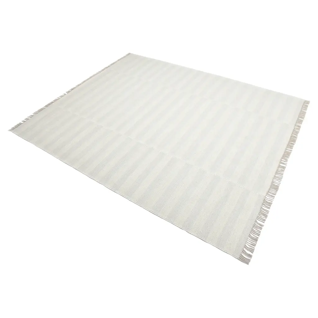This Ivory Flatweave Wool Cotton Blend Rug offers a versatile foundation for various interior designs. Crafted with a blend of 80% wool and 20% cotton, it combines the natural durability and resilience of wool with the softness and breathability of cotton. The rug features a flatweave construction, a technique known for creating low-profile, durable textiles. This construction makes the rug suitable for high-traffic areas and often allows for reversibility, extending its functional life. Handwoven in India, the rug reflects artisan craftsmanship. Its ivory color palette is accented by a subtle, tonal striped pattern across the surface, adding texture and visual interest without overwhelming a room's existing decor. This design allows the rug to complement a range of styles, from modern minimalist to classic transitional settings. Short, integrated fringes complete the design at each end. Measuring 5 feet by 8 feet, this area rug is appropriately sized for placement in living rooms, bedrooms, dining spaces, or larger entryways. Its low pile height reduces tripping hazards and makes it easy to position under furniture.