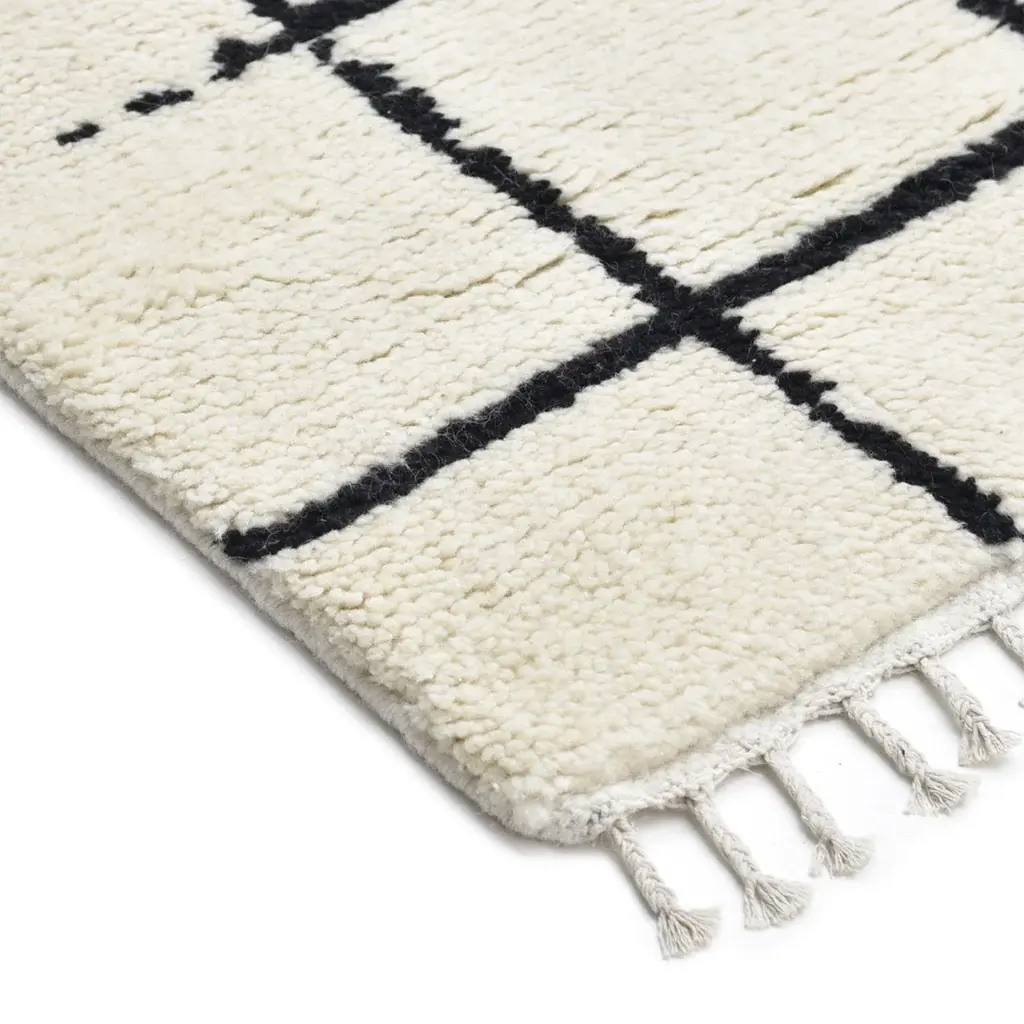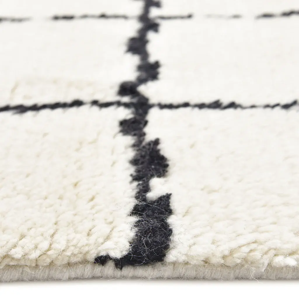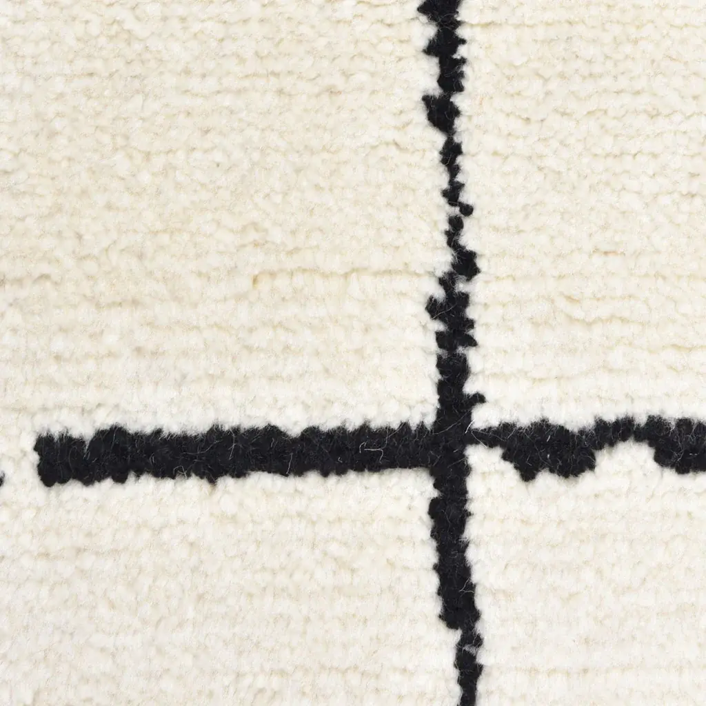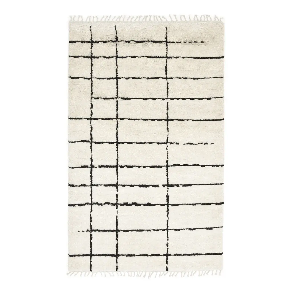 Hand-knotted of sumptuous wool with a geometric grid design inspired by centuries-old tribal motifs, this Handmade Abstract Grid Moroccan Shag Rug - 8' x 10' features a neutral-toned palette in shades of ivory and black. Moroccan rugs like this rug, Beni Ourains, and boucherouites are highly prized for their plush pile that makes walking barefoot a delight. This Moroccan area rug will bring intriguing texture, as well as, a dash of irresistible design to your living room, bedroom, or beyond!