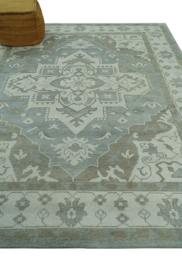 Expertly crafted with traditional Heriz design, this Floral Ivory, Silver, and Olive Hand Knotted Rug adds timeless elegance to any room. Made of wool for durability and comfort, its beautiful medallion pattern in multi-sizes offers versatility and sophistication. Enrich your space with this exquisite rug. Hand-Knotted Made with Wool Made to Order in 30-45 Days Color: Ivory, Silver, and Olive This specific rug is made in India, in the city of Bhadohi. Bhadohi is one of the biggest rug manufacturing cities. Carpet weaving in the region dates back to the 16th century during the reign of Akbar. The skilled artisans of Bhadohi have been carrying the rug-making tradition for centuries. USERS GUIDE Avoid prolonged moisture Vacuum regularly and/or shake to remove dust Do not pull any loose threads. Use scissors to cut the ends simply Blot spills immediately with a white cloth. Harsh chemicals may damage or fade the rug Use rug protectors under heavy furniture