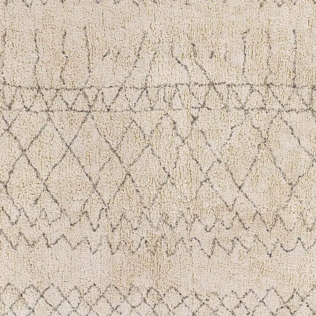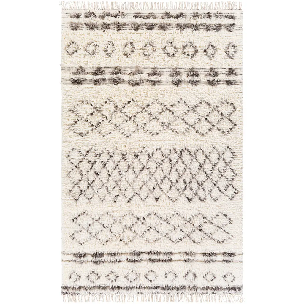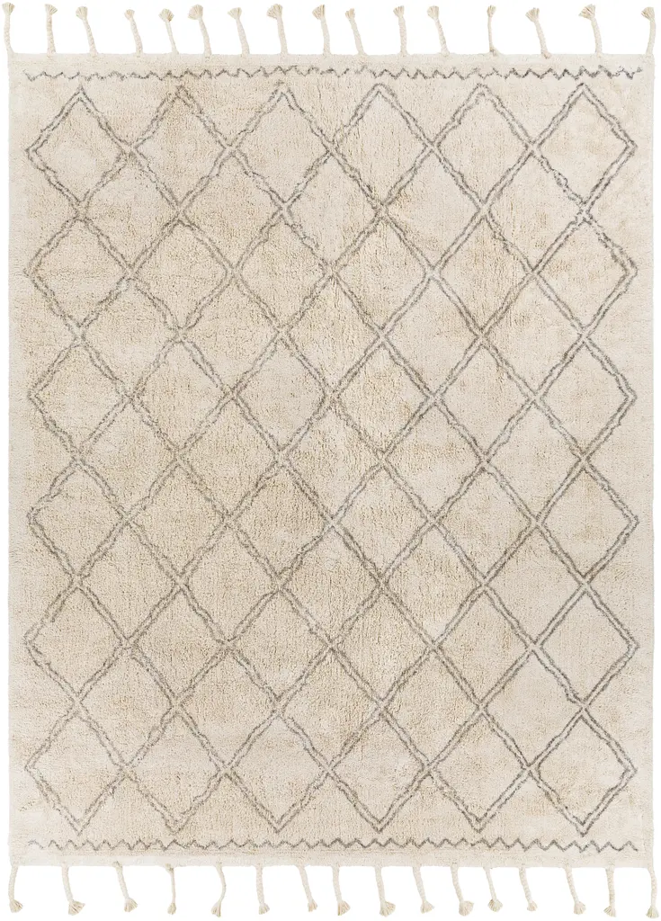 Collection: Jacana Colors: Cream, Gray Construction: Hand Woven Material: 100% Cotton Pile: No Pile Styles: Transitional,Bohemian Made In: India Thickness: 1" Fringe Length: 3.5" Price Range: $$$$$ (Most Affordable)
