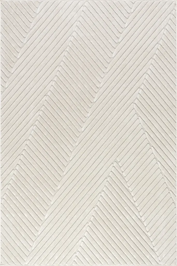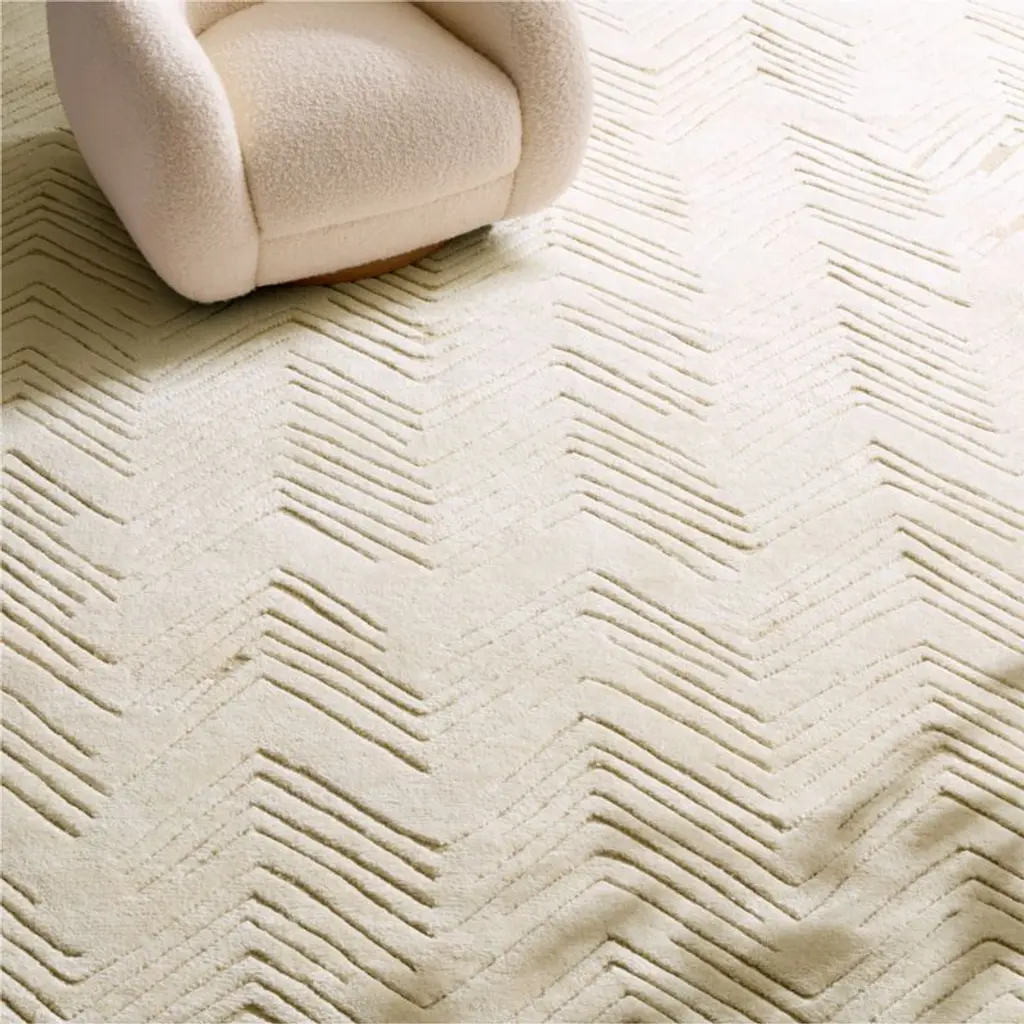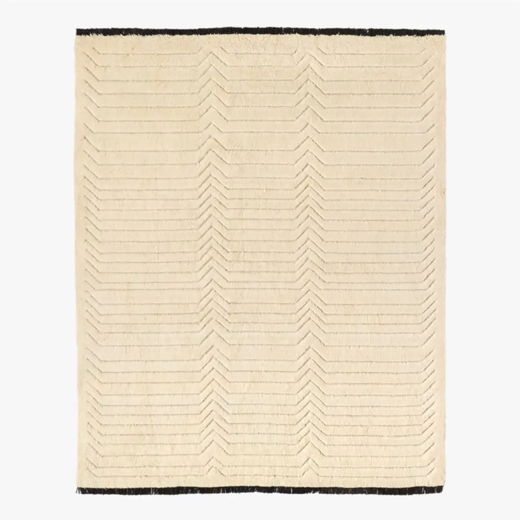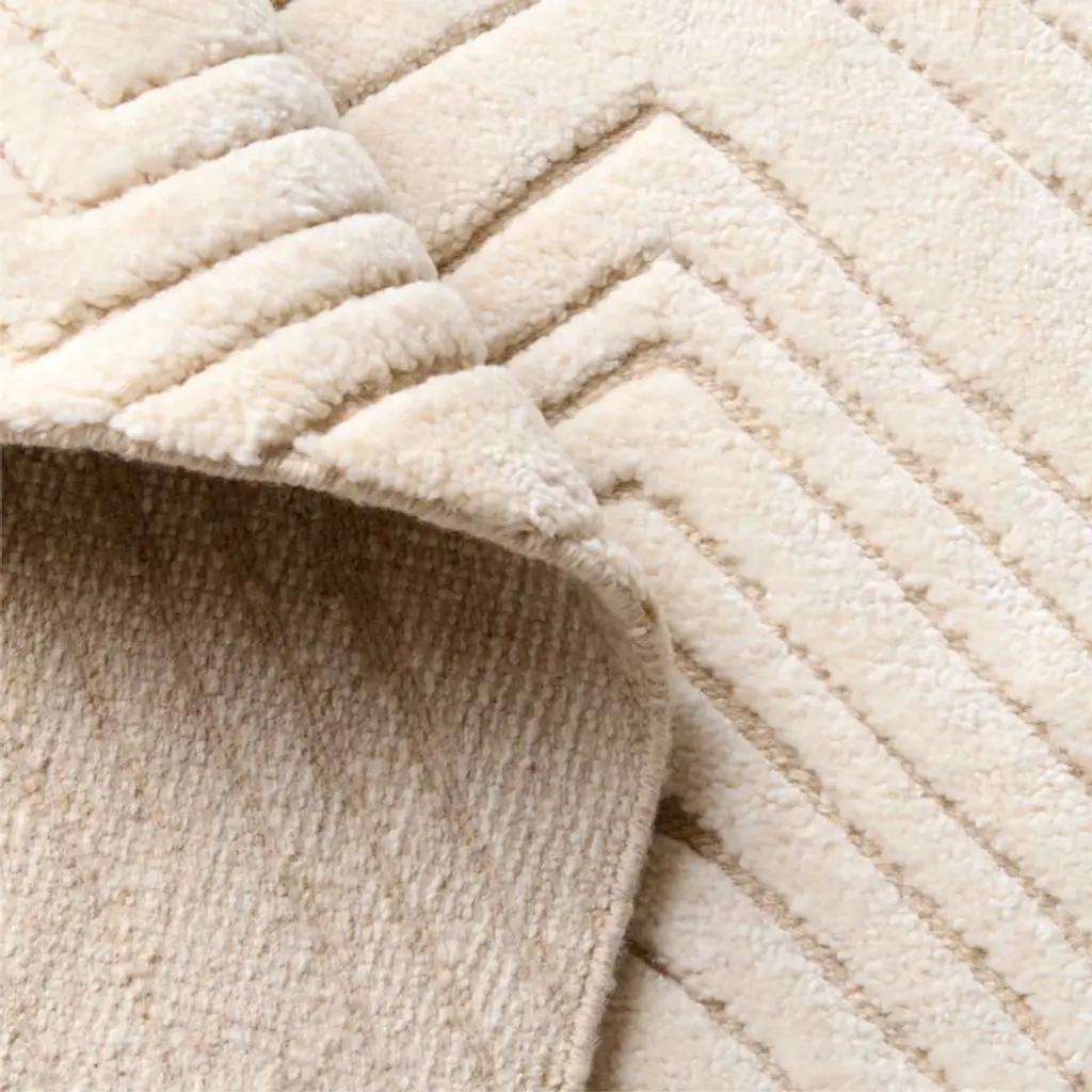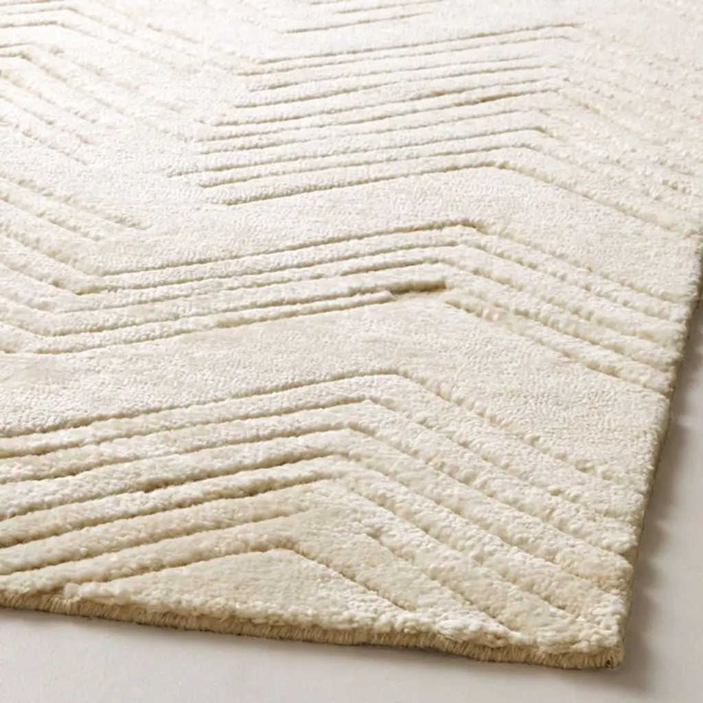 Crafted from a luxurious blend of wool and viscose, hand-knotted rug balances softness with a subtle, luminous sheen. A geometric pattern unfolds across the surface, brought to life through a high-low construction that's hand-embossed for added depth and dimension. Understated yet sculptural, warm white rug is well-suited for medium-traffic space. CB2 exclusive.How will it look in your room? 12"x12" rug samples are available in stores for a fee refundable upon return of the sample.