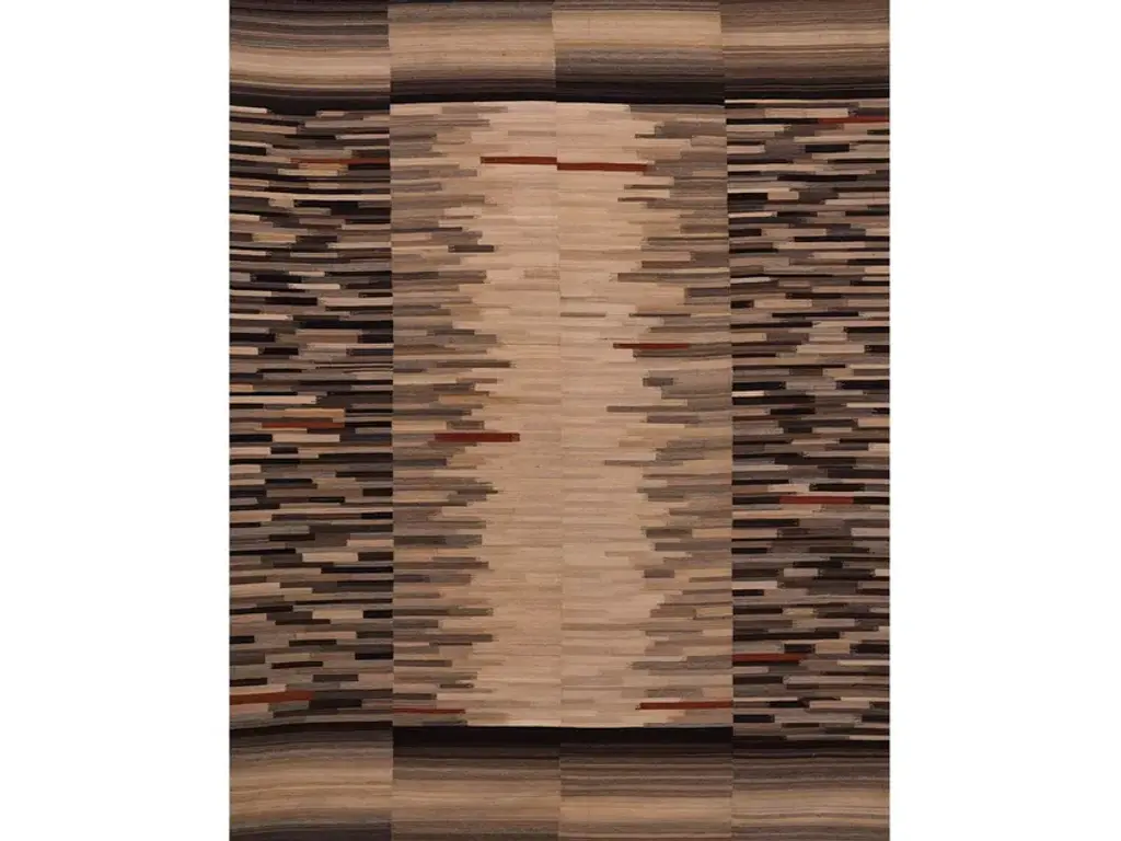Jagged Edge 4 Cool is a rectangular wool rug.Zollanvari ‘minimalist’ kilims are diverse. Baneh kilims are woven in northern regions in sections using natural undyed wools and then skilfully stitched together. The one-piece Zagros kilims woven by the Luri and Ghashgha’i nomads are monochromatic. They have traditional ‘lazy lines’ that form subtle patterns of diamonds and squares. Maryam kilims, woven by the same tribes, have plain ground colours with repeat motifs hand-embroidered in pure silk, awarded Best Innovation at the CDAs in 2009. The jewel in the crown of our ‘minimalist’ flatweaves is a collection that draws inspiration from the old and antique Mazandaran kilims that have appeared on the market in the past decade – a truly modern collection. Caprino is a new flatweave collection woven from undyed goat’s hair on which pile-knotted erratic modernist lines in bright colours are superimposed.