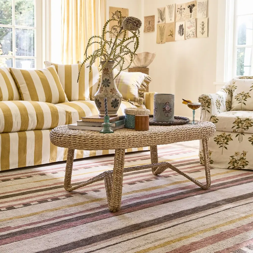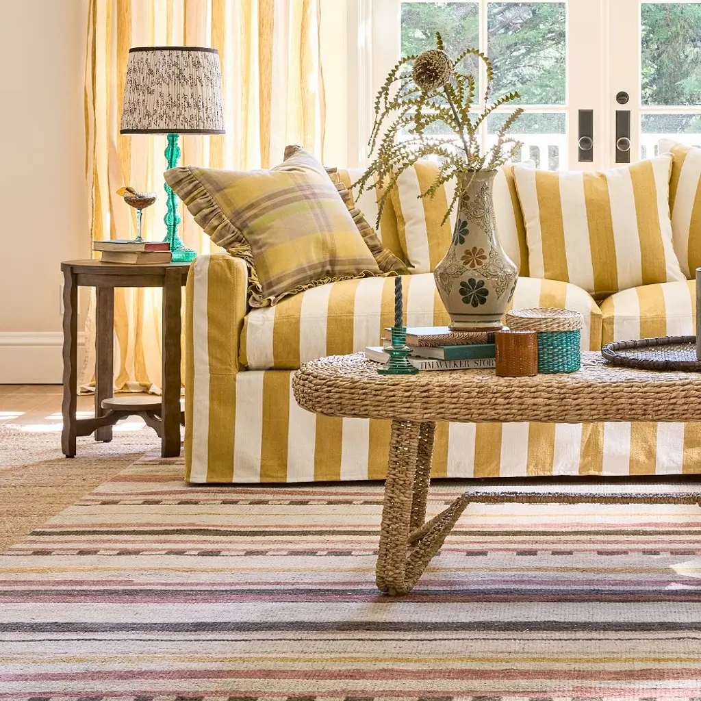 Walk the line. Gentle texture relaxes the staggered stripes of this handknotted rug—in a rich blend of RWS-certified wool, cotton, and linen for supreme softness.