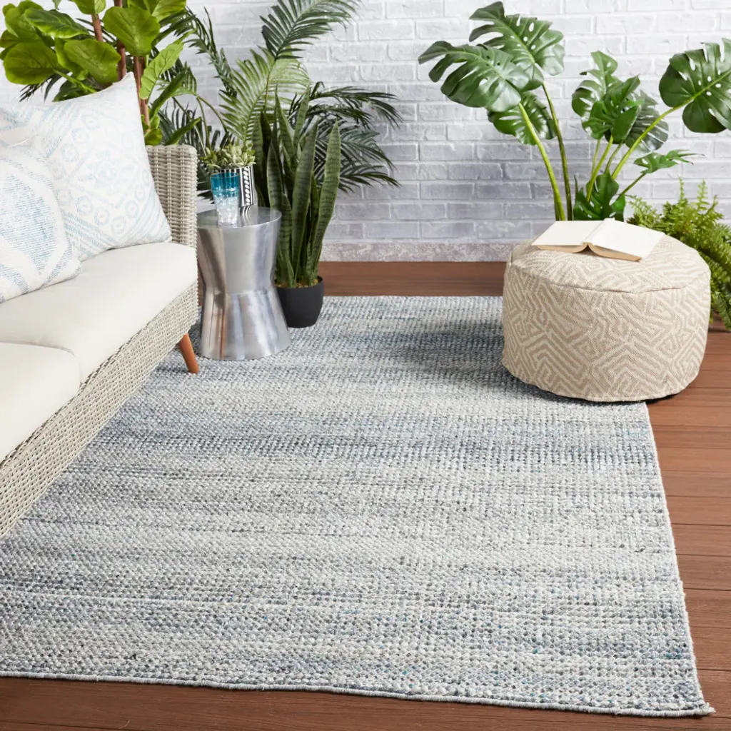 Contemporary and versatile, the eco-friendly Rebecca collection offers a sophisticated, solid design to high-traffic areas and outdoor spaces. The Crispin area rug delivers a fresh accent to patios, kitchens, and dining rooms with its ultra-durable PET yarn handwoven construction. The striated tones of blue and white lend a bright and airy look to any home.High-Performance Style: this indoor/outdoor rug is specifically designed to tolerate outdoor elements and heavy trafficEco-Friendly Fibers: made in India of 100% PET yarn (recycled plastic bottles)Textured Pile: 0.5 inch looped pile creates a soft, ridged feelCare and Cleaning: Clean or remove stains by using mild soap. Rinse with clean water or a garden hose. Hang and allow rug to dry before laying rug out. Vacuum regularly with beater bar off for indoor use.Rug Pad Recommended: allow maximum air flow and additional cushioning with an outdoor rug pad