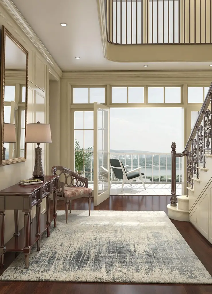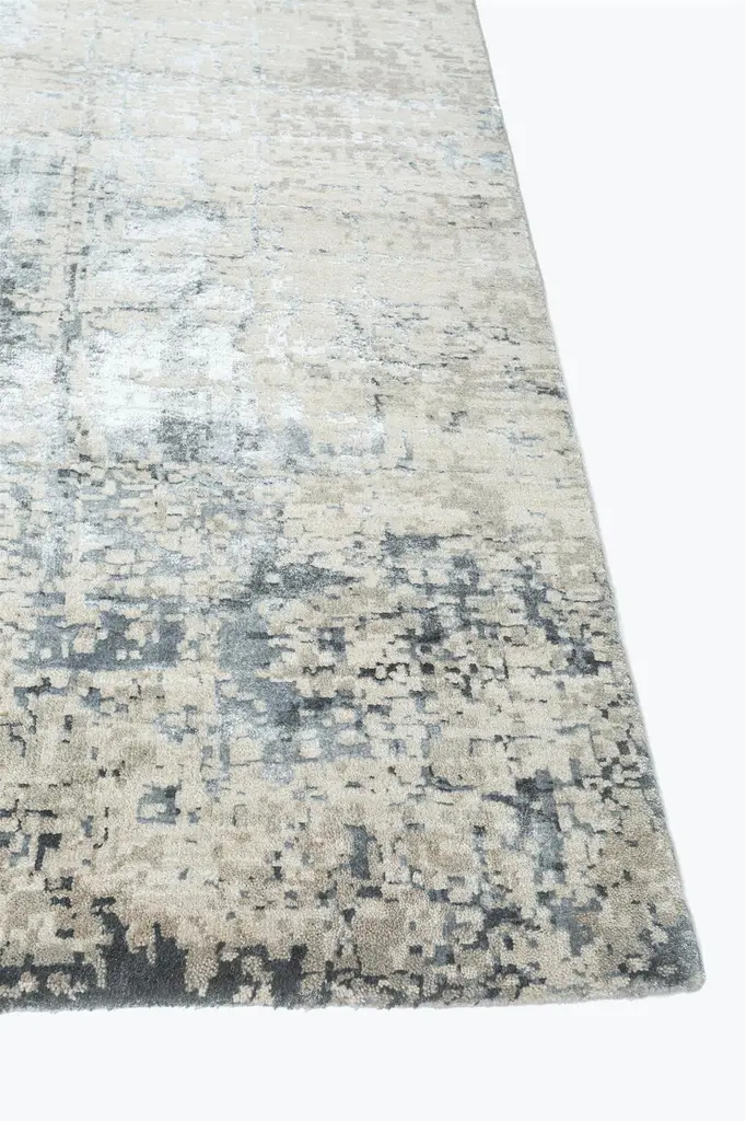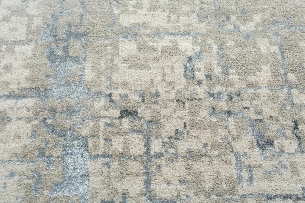 Introducing a fusion of classic gray and pastel blue in a modern, hand-knotted marvel crafted from wool and bamboo silk. It brings untold stories of rustic charm to contemporary spaces, reflecting rural India's rich traditions, shapes, and colors. This rug in this exquisite line blurs the barriers between urban luxury and the charming simplicity of village life. Elevate your living spaces with the artistry of this handmade rug that weaves a tapestry of timeless elegance and cultural heritage.