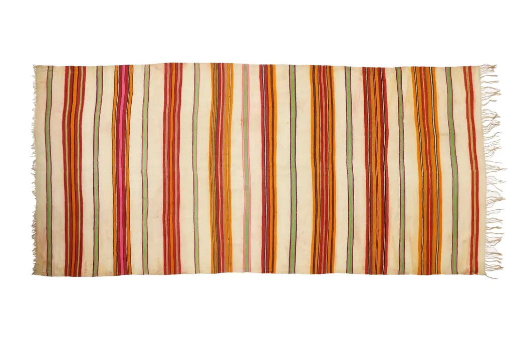 Jajim 10 is a rectangular wool rug.Our highly popular jajims are woven exclusively for us by the tribes of the southwestern region of Iran. They are colourful flatweaves (sometimes in mixed techniques), with and without decorative overlaid-embroidery and sewn-on pom poms. The designs are mainly geometric and typical of the aesthetics of the nomadic tribes that weave them, yet they have a thoroughly contemporary feel. This makes them ideal decorative complements for any interior when used as throws and covers. The tribal flatweaves or kilims (known as gelims in Farsi) are traditional colourful weavings with bold geometric and floral designs. They are woven by Luri and Ghashgha’i nomads who interpret centuries’ old designs and motifs that have been handed down from generation to generation.