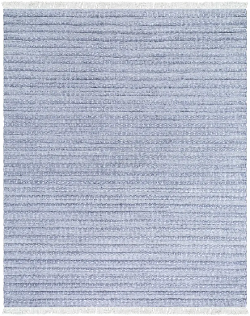 Collection: Jake Colors: Blue, Ivory, Cream Construction: Hand Woven Material: 100% Recycled PET Yarn Pile: No Pile Styles: Contemporary Made In: India Thickness: 0.25" Fringe Length: 3" Price Range: $$$$$ (Most Affordable)