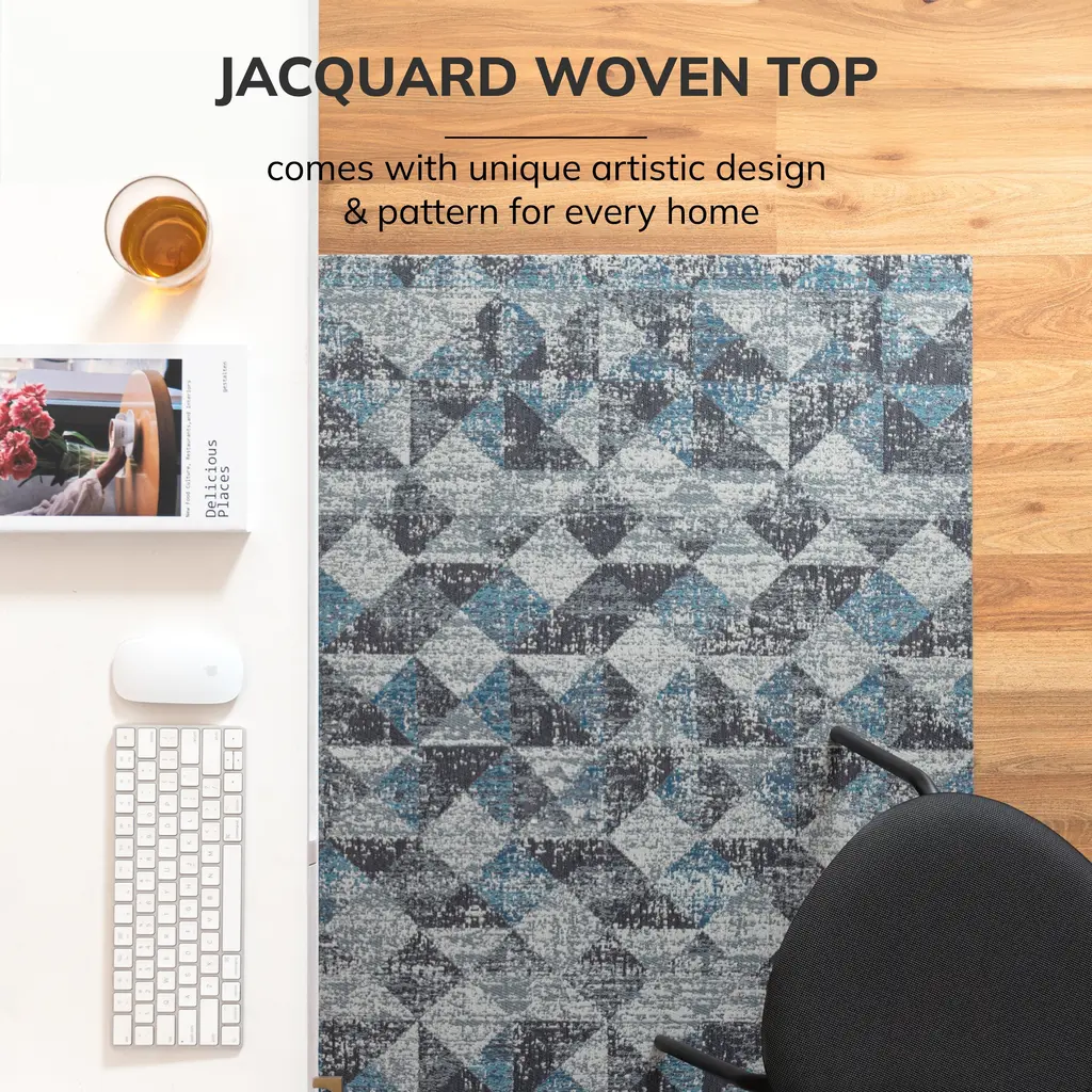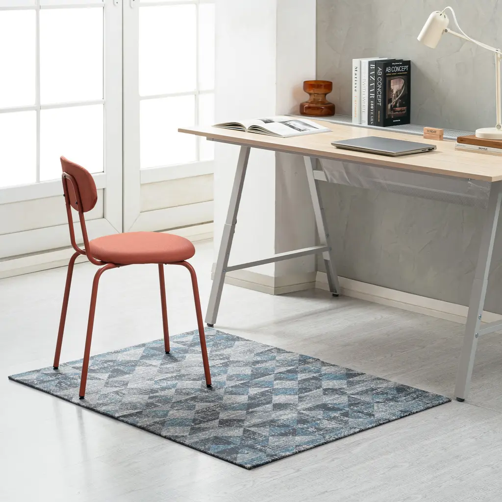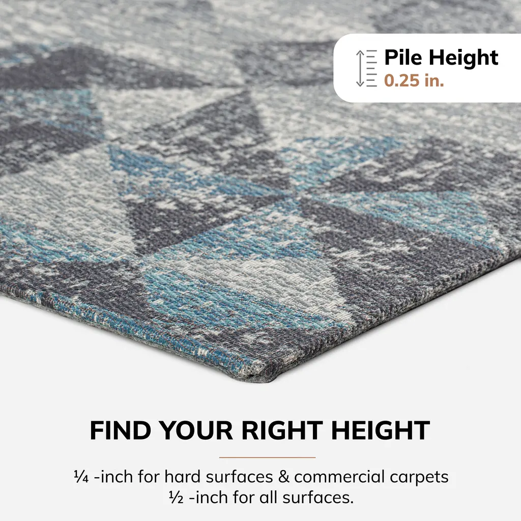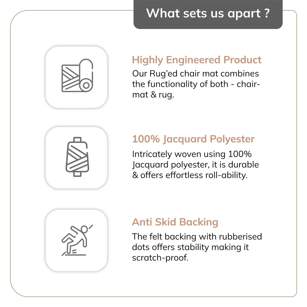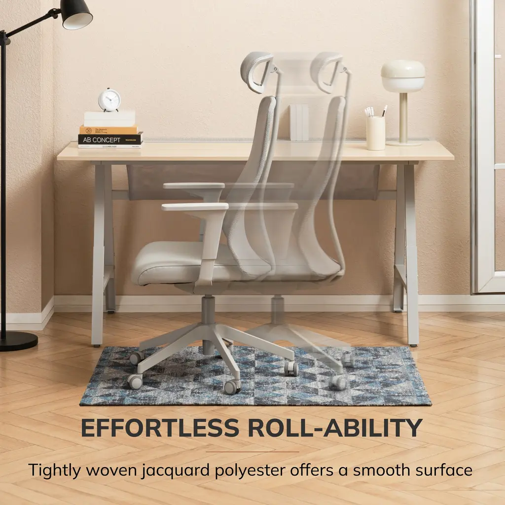 Upgrade your workspace with the Jani Rug'd Chair Mat™, a stylish and durable solution that will elevate the aesthetic of any room. This hand-crafted mat is made from 100% Jacquard-woven Polyester with a 0.25" thick phthalate-free PVC core, providing sturdy support for commercial carpet and hard floors. The tight weave of the rug surface allows chair casters to roll effortlessly, while the non-skid felt backing with rubberized dots keeps the mat securely in place on any floor type. With multiple design options, the Rug'd Chair Mat™ is the perfect way to showcase your personality and style in the office. Plus, its simple bi-fold design makes it easy to move or ship without any rolling or spikes. Keep it looking its best with simple spot cleaning using mild dish soap and water.Features: