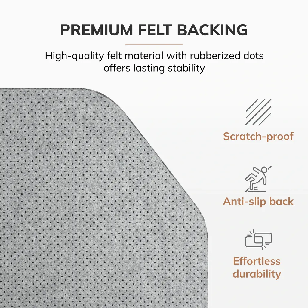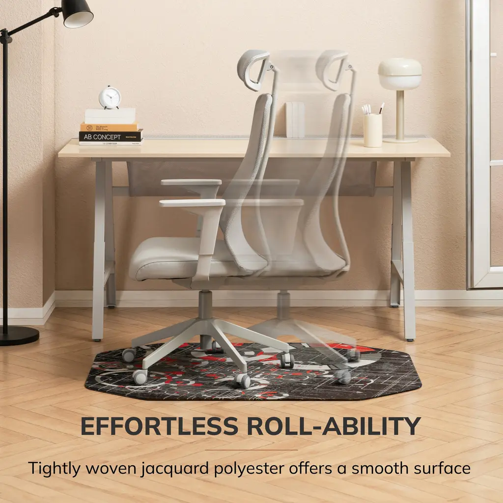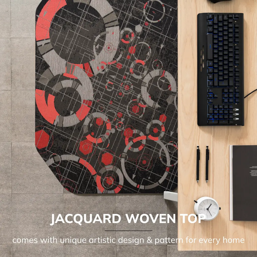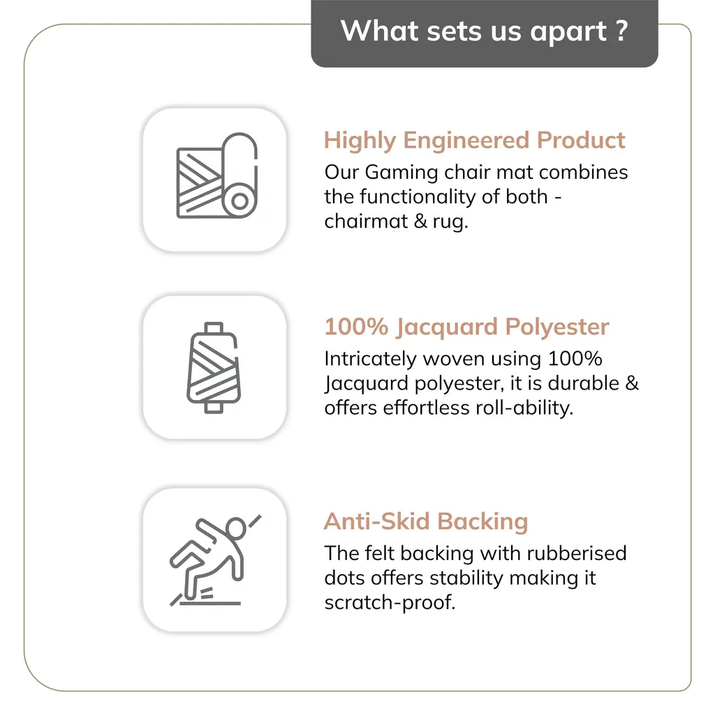 Highly engineered and thoughtfully curated, our Gaming chair mat combines the functionality of both chair mat and rug. The tightly woven top made using 100% Jacquard polyester features unique patterns offering a smooth glide for chair casters. The core is crafted from Phthalate-free PVC offering sturdy support and durability, while the non-skid felt backing with rubberised dots keeps it secure on any surface, from hard floors to plush carpets. Immerse yourself in gaming sessions without compromising on comfort or performance.