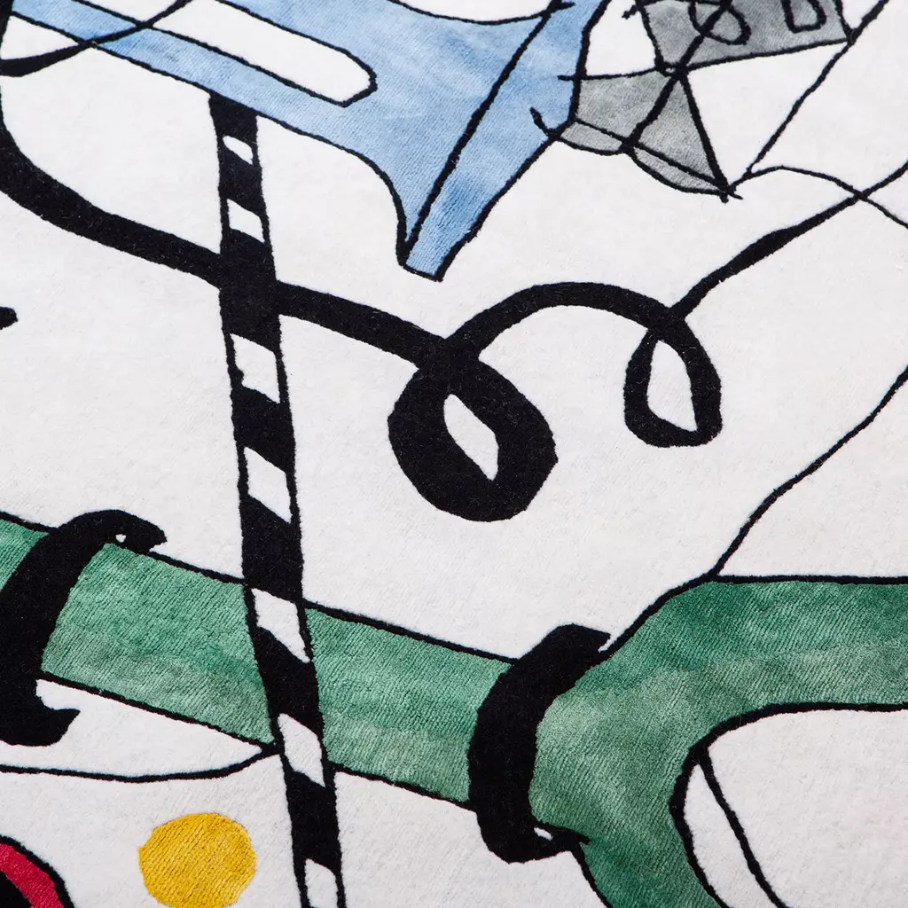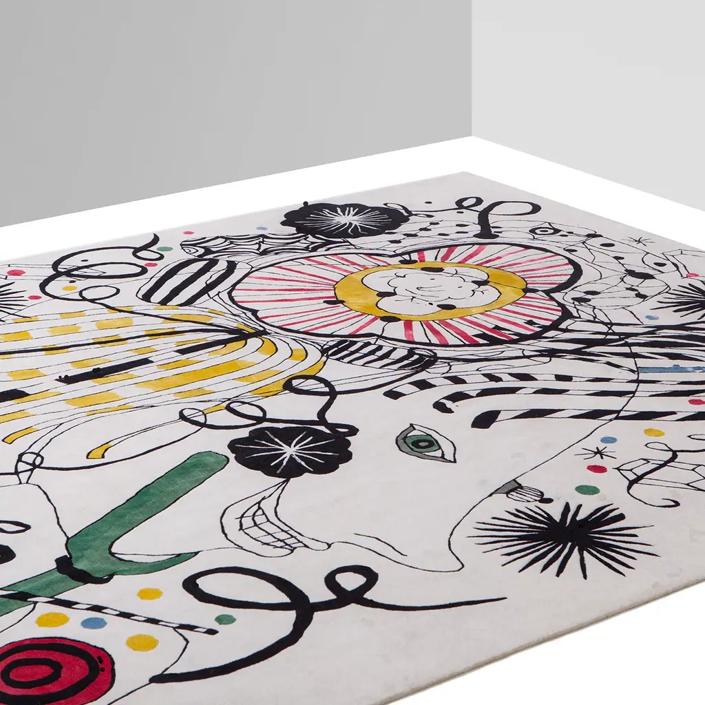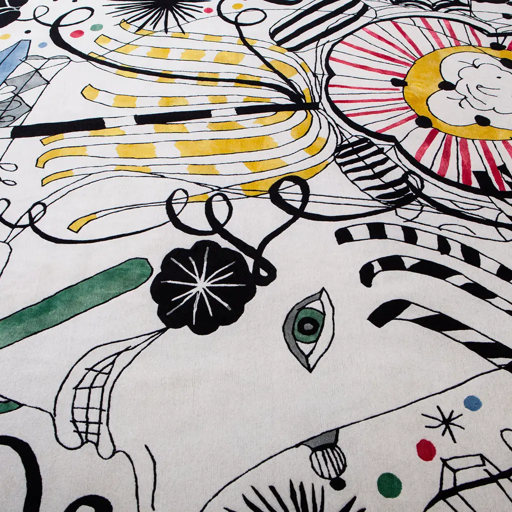 Reminiscent of Paul Klee's iconic creations, this rug is hand-knotted in Nepal with a blend of wool and Chinese silk in an eclectic combination of whimsical elements set on a white background. The use of bold colors and thick lines in the architectural motifs juxtapose the fine line work in the face and surrounding decorations of the composition. The resulting image is a vibrant composition that will enliven a modern and contemporary interior dominated by a monochromatic palette. Part of a limited edition of only 10 pieces, this exquisite rug is 200-knot per inch with 5-mm pile height.
