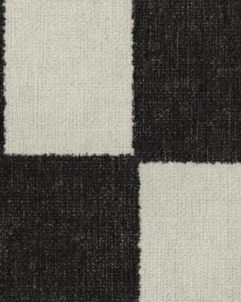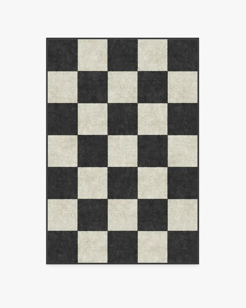 Let's play. Our Jaque Checkered Black Rug brings washability to a classic checkerboard design, mixing textured black squares against a soft pearl background. Water-resistant, stain-resistant, and machine-washable.