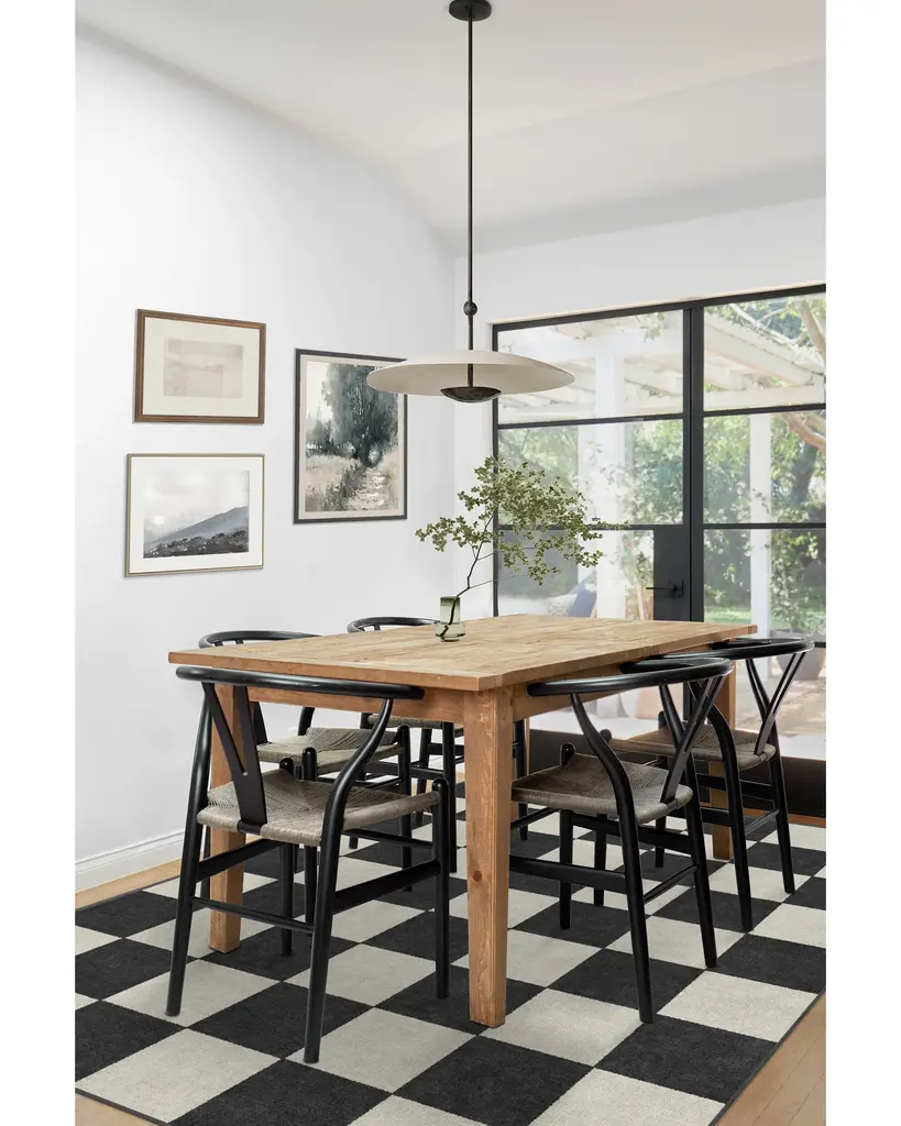 Let's play. Our Jaque Checkered Black Rug brings washability to a classic checkerboard design, mixing textured black squares against a soft pearl background.