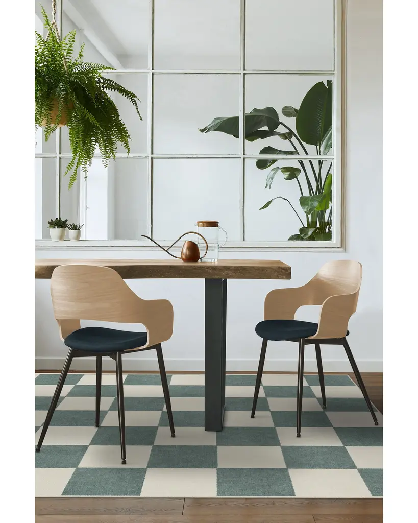 Let's play. Our Jaque Checkered Slate Green Rug brings washability to a classic checkerboard design, mixing soft spruce green squares with a neutral pearl background. Water-resistant, stain-resistant, and machine-washable.
