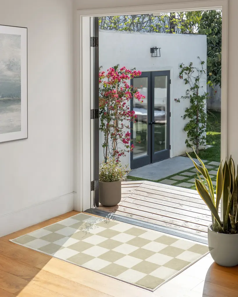 Let's play. Our Jaque Checkered Stone Rug brings washability to a classic checkerboard design, mixing warm, soft cappuccino squares against a soft pearl background.