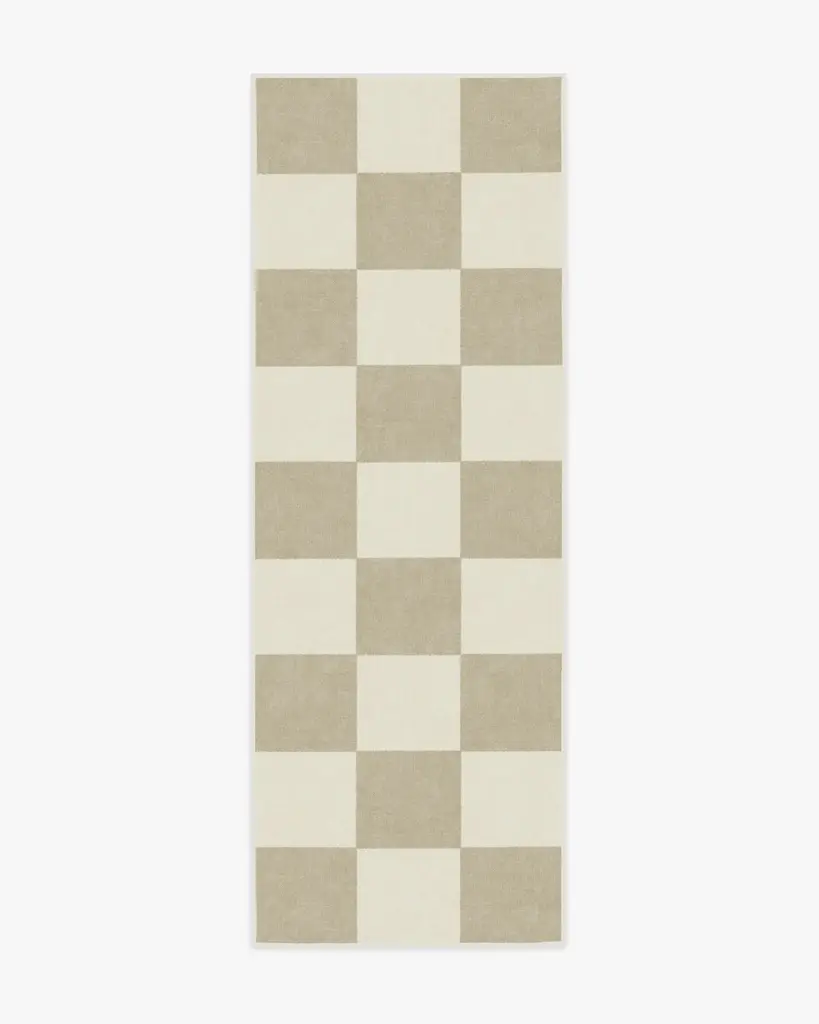 Let's play. Our Jaque Checkered Stone Rug brings washability to a classic checkerboard design, mixing warm, soft cappuccino squares against a soft pearl background. Water-resistant, stain-resistant, and machine-washable.