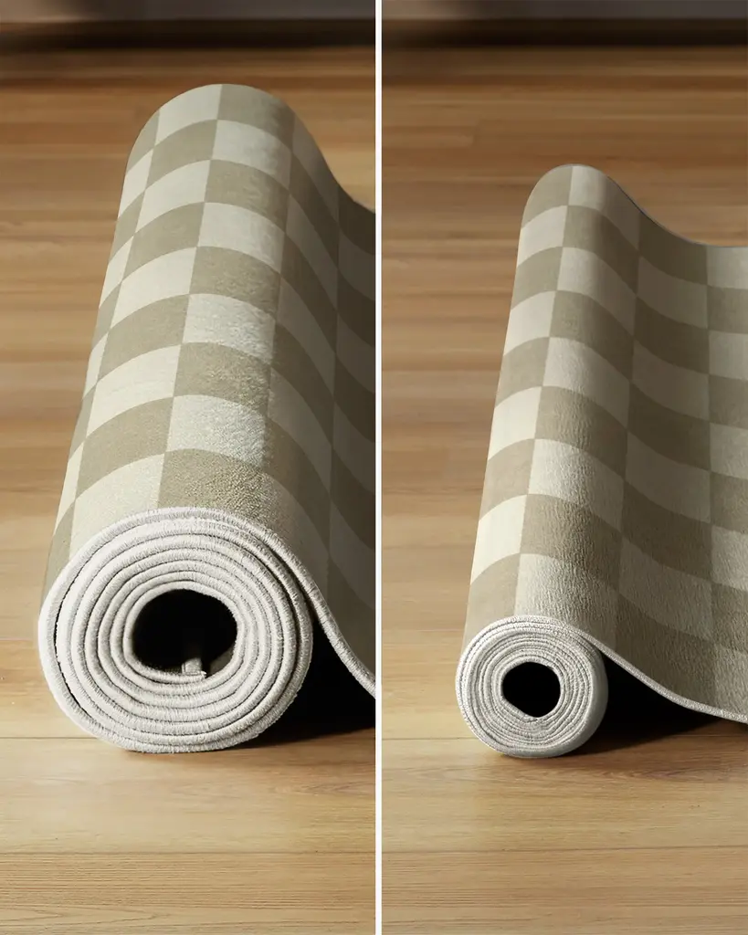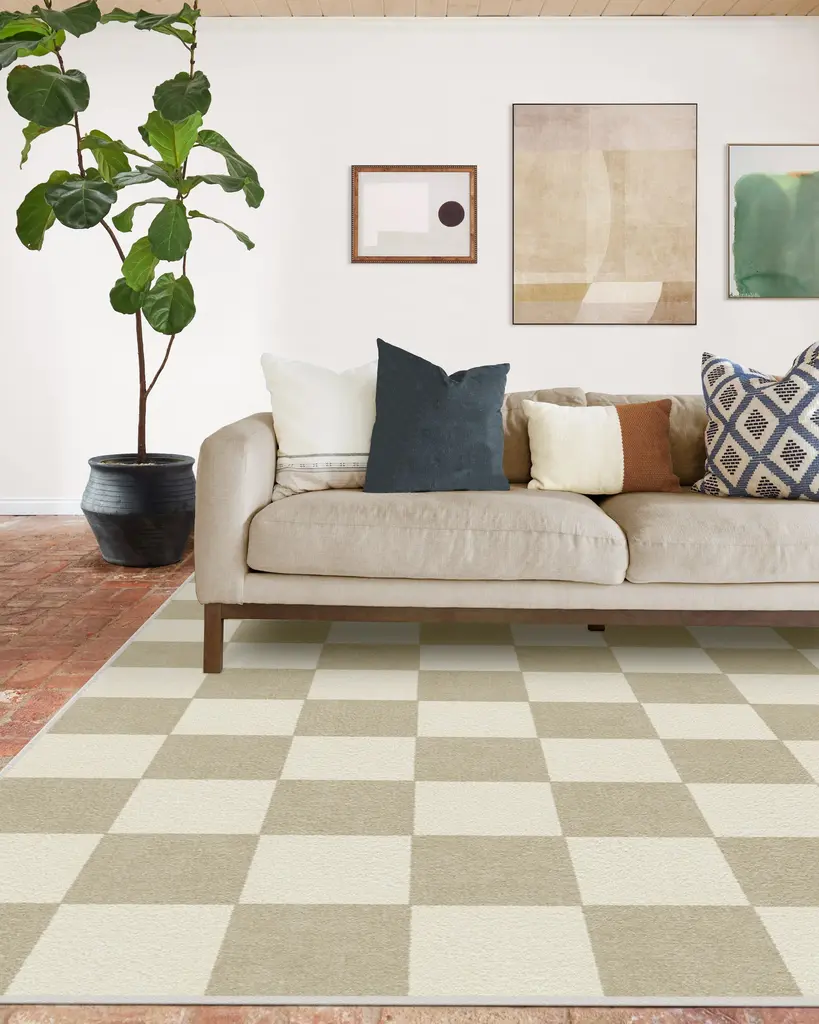 Let's play. Our Jaque Checkered Stone Rug brings washability to a classic checkerboard design, mixing warm, soft cappuccino squares against a soft pearl background.