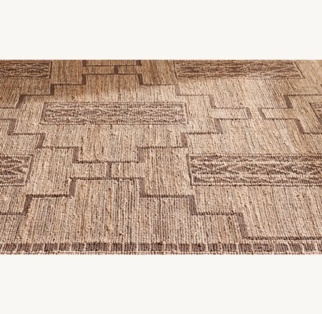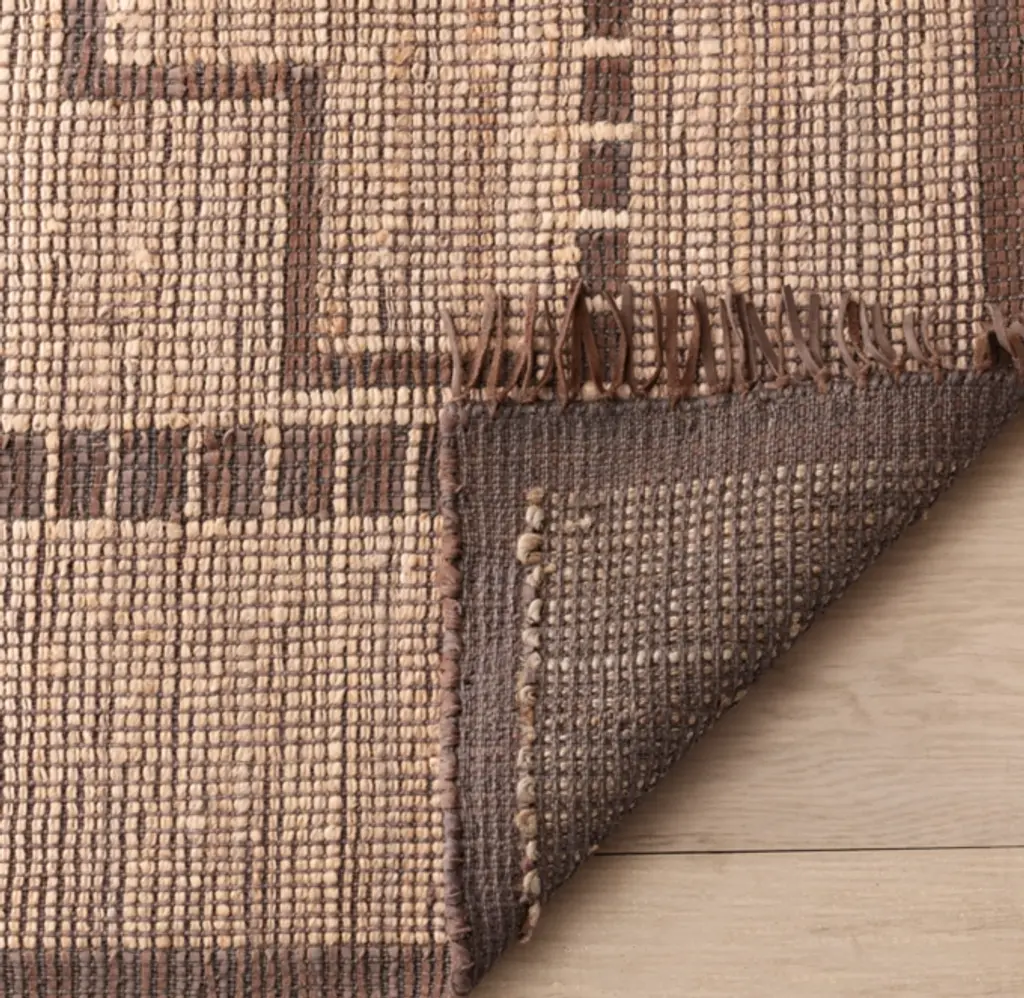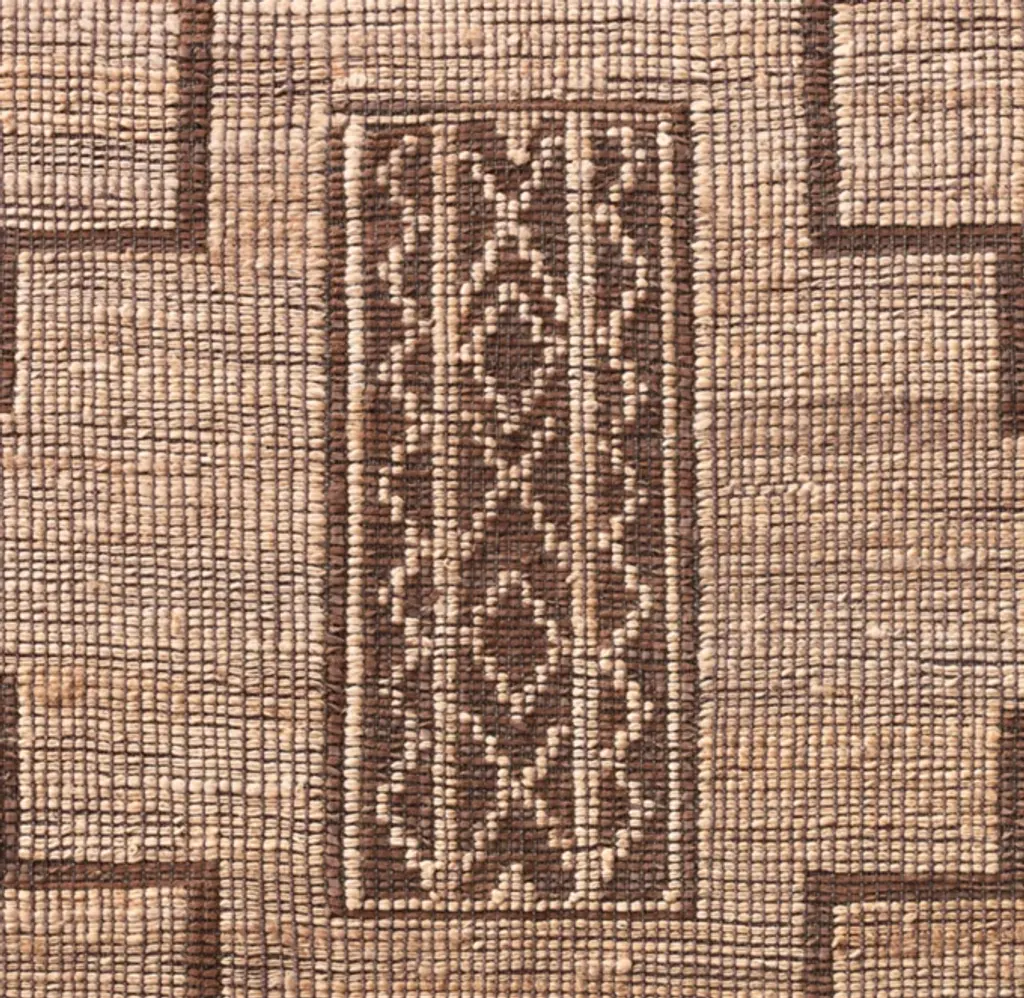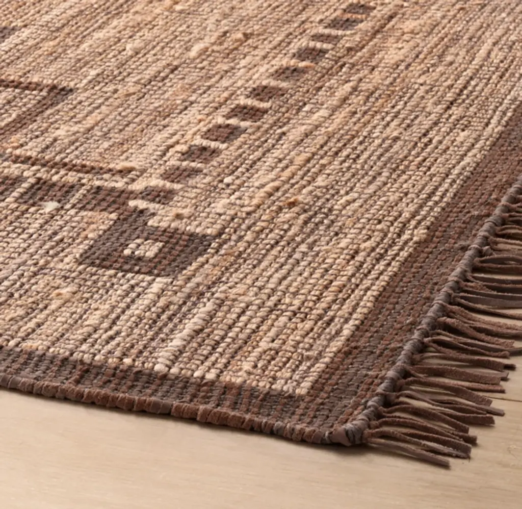 Distilled from the design of a vintage Saharan Tuareg mat, Javan's diamonds and zigzags are updated in handwoven natural jute and leather. A delicately singed finish enhances the patina of the jute's organic abrash shading.