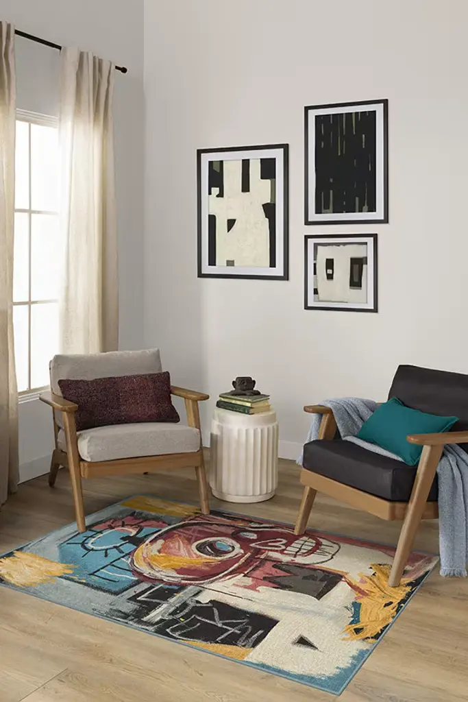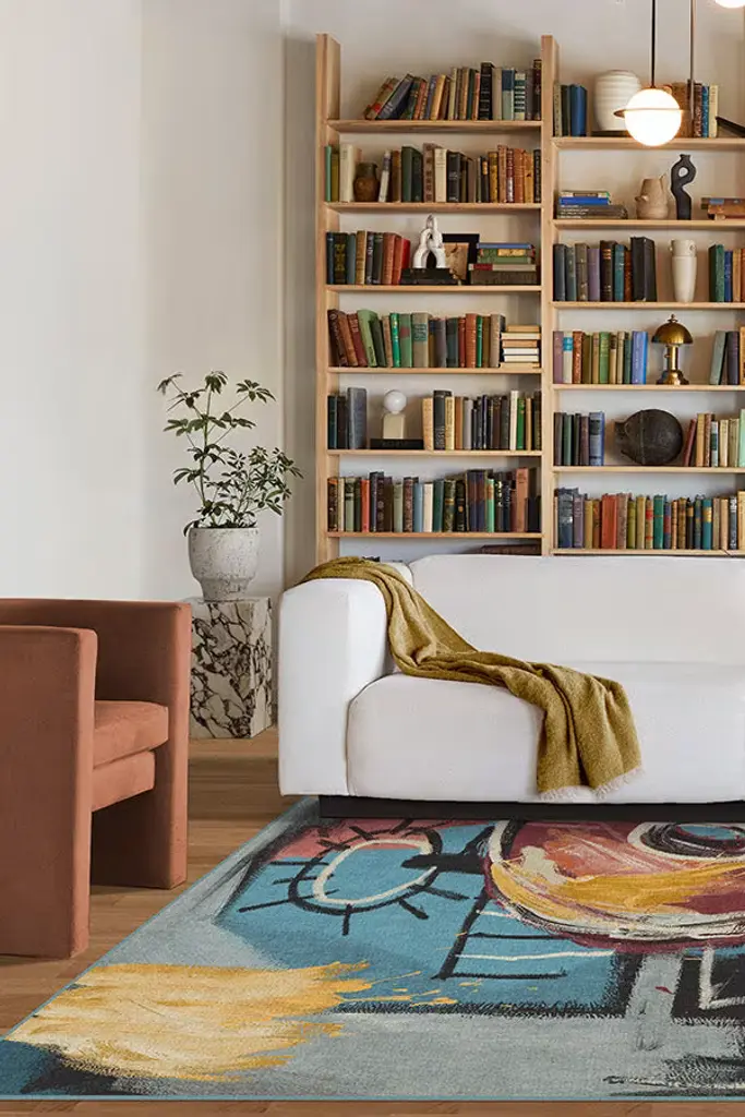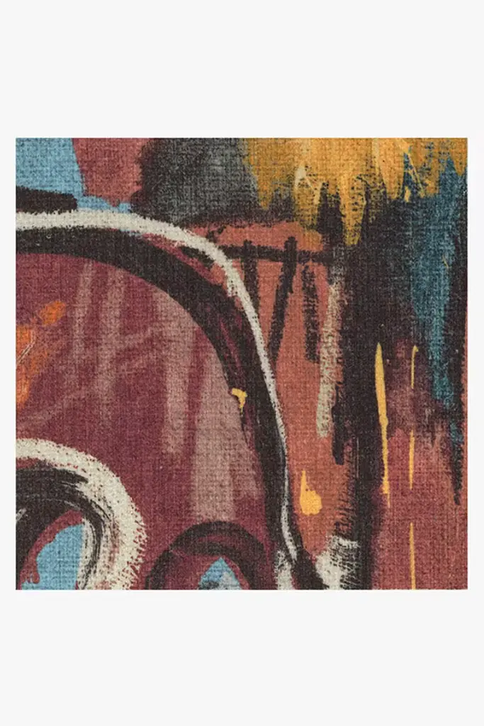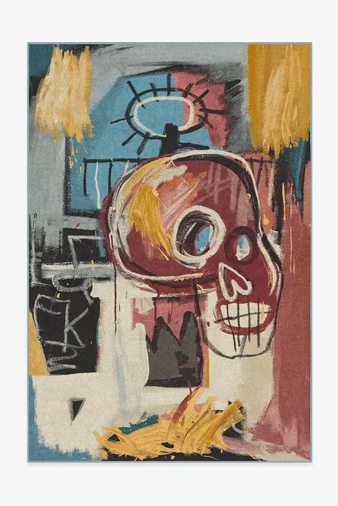 Inspired by one of Basquiat's many skull paintings, our Jean-Michel Basquiat Samo Skull Multicolor Rug features lush colors and heavy, stylized brushstrokes. Warm red tones are the centerpiece, filling and framing the skull motif, while heavy black strokes balance the intense pops of blue. Other iconic symbols that Basquiat is known for in his work, such as the crown and halo, are also present. Water-resistant, stain-resistant, and machine-washable. Rug colors may vary slightly according to your device and the lighting in your space.