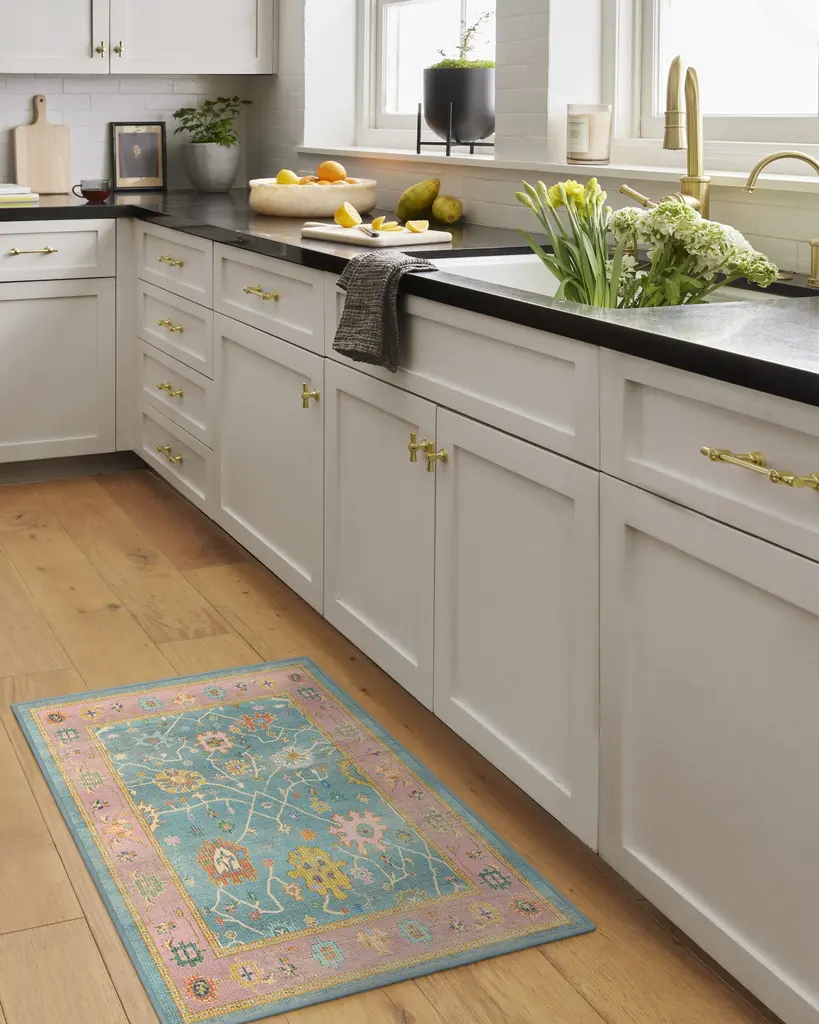 Bring the romance, without the drama, with our Regency-era Jemima Multicolor Rug. Inspired by timeless Oushak rugs, this pink-bordered, opulent design has a playful blend of bright chartreuses, reds, and oranges placed atop a warm blue background. Water-resistant, stain-resistant, and machine-washable. Rug colors may vary slightly according to your device and the lighting in your space.