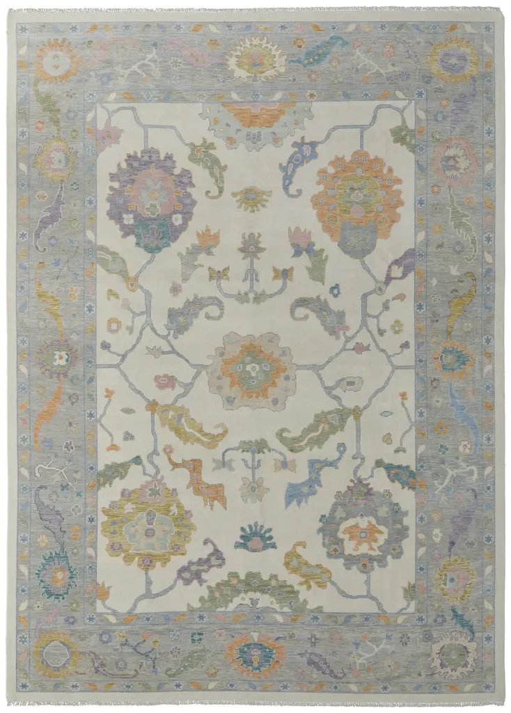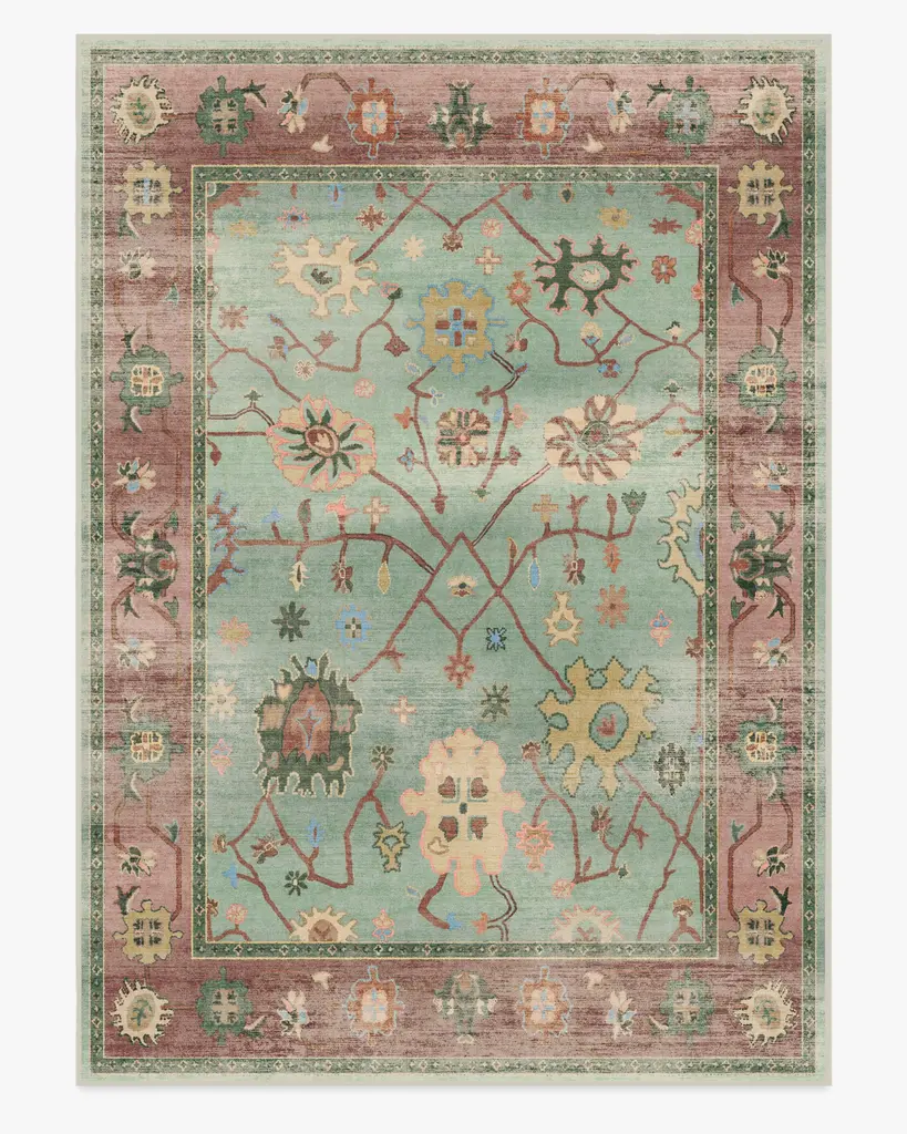Bring the romance, without the drama, with our Regency-era Jemima Multicolor Rug. Inspired by timeless Oushak rugs, this pink-bordered, opulent design has a playful blend of bright chartreuses, reds, and oranges placed atop a warm blue background. Water-resistant, stain-resistant, and machine-washable. Rug colors may vary slightly according to your device and the lighting in your space.
