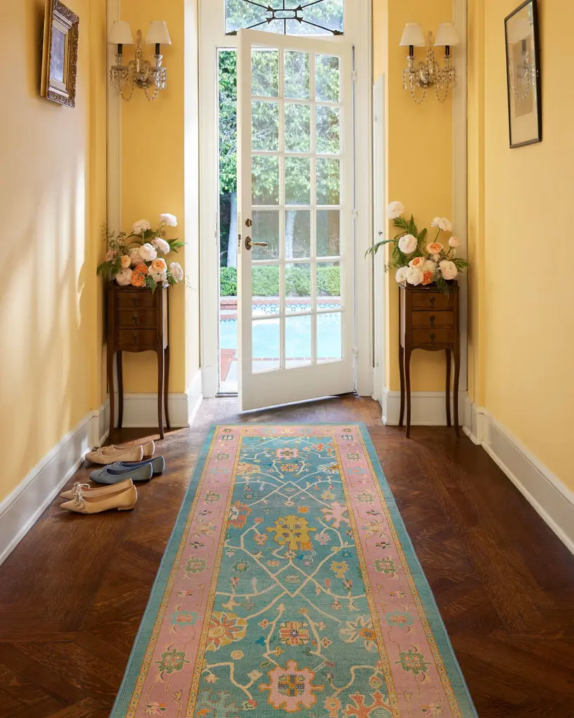 Bring the romance, without the drama, with our Regency-era Jemima Multicolor Rug. Inspired by timeless Oushak rugs, this pink-bordered, opulent design has a playful blend of bright chartreuses, reds, and oranges placed atop a warm blue background. Water-resistant, stain-resistant, and machine-washable. Rug colors may vary slightly according to your device and the lighting in your space.