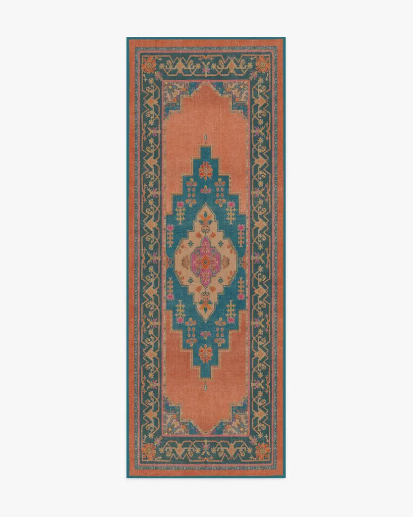 Bring the romance, without the drama, with our Regency-era Jemima Multicolor Rug. Inspired by timeless Oushak rugs, this pink-bordered, opulent design has a playful blend of bright chartreuses, reds, and oranges placed atop a warm blue background. Water-resistant, stain-resistant, and machine-washable. Rug colors may vary slightly according to your device and the lighting in your space.