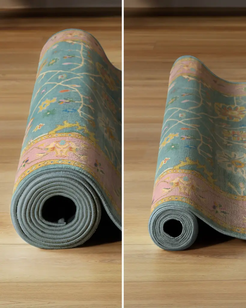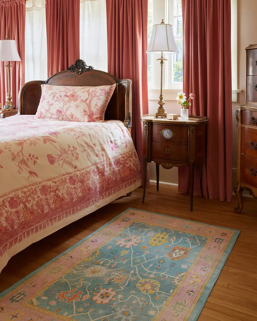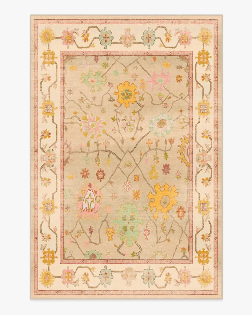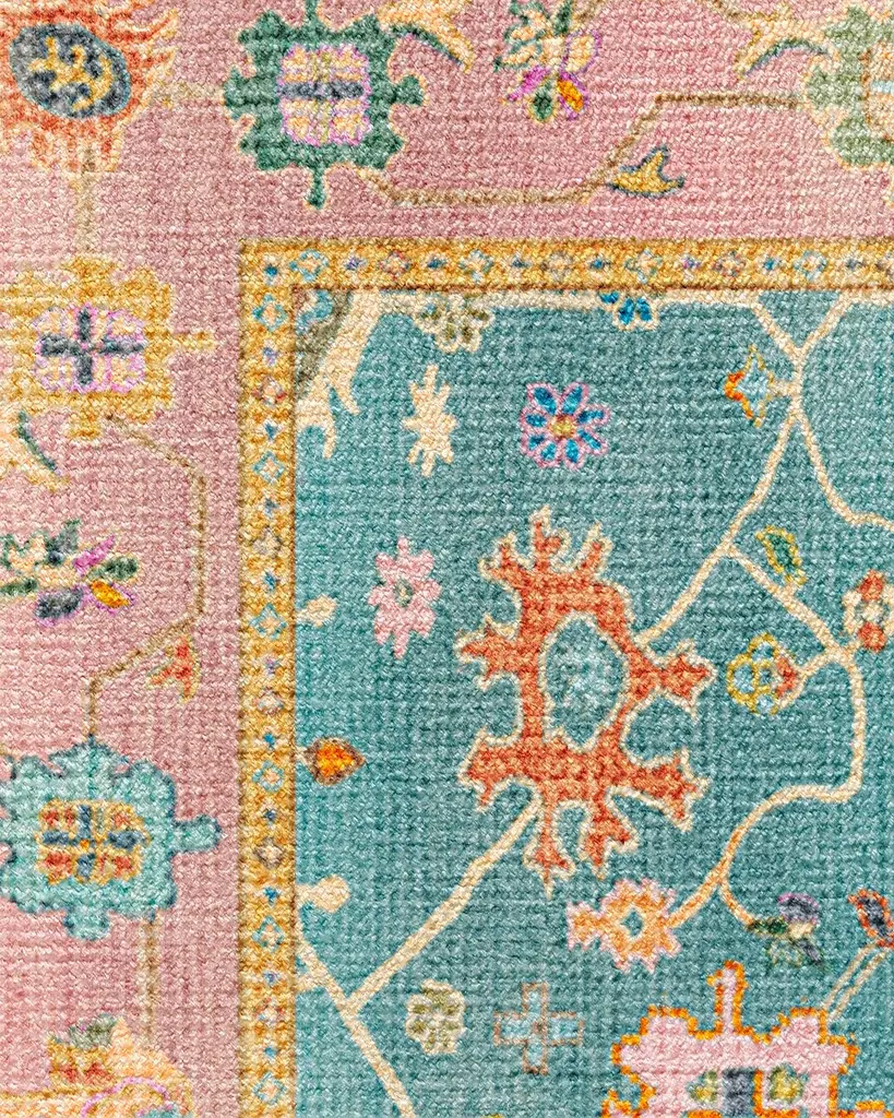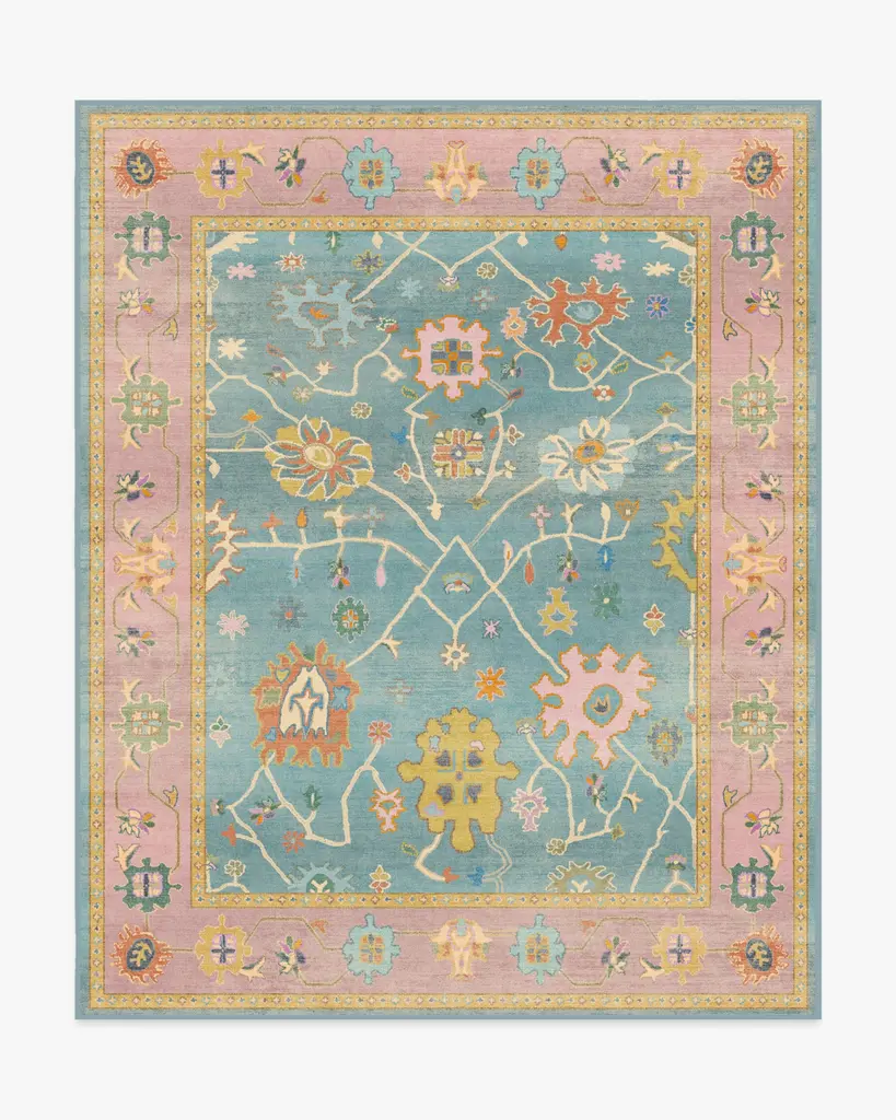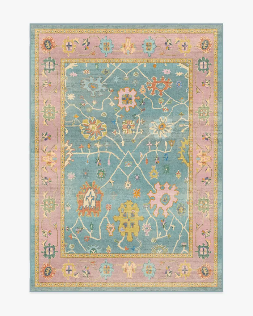 Bring the romance, without the drama, with our Regency-era Jemima Multicolor Rug. Inspired by timeless Oushak rugs, this pink-bordered, opulent design has a playful blend of bright chartreuses, reds, and oranges placed atop a warm blue background. Water-resistant, stain-resistant, and machine-washable. Rug colors may vary slightly according to your device and the lighting in your space.