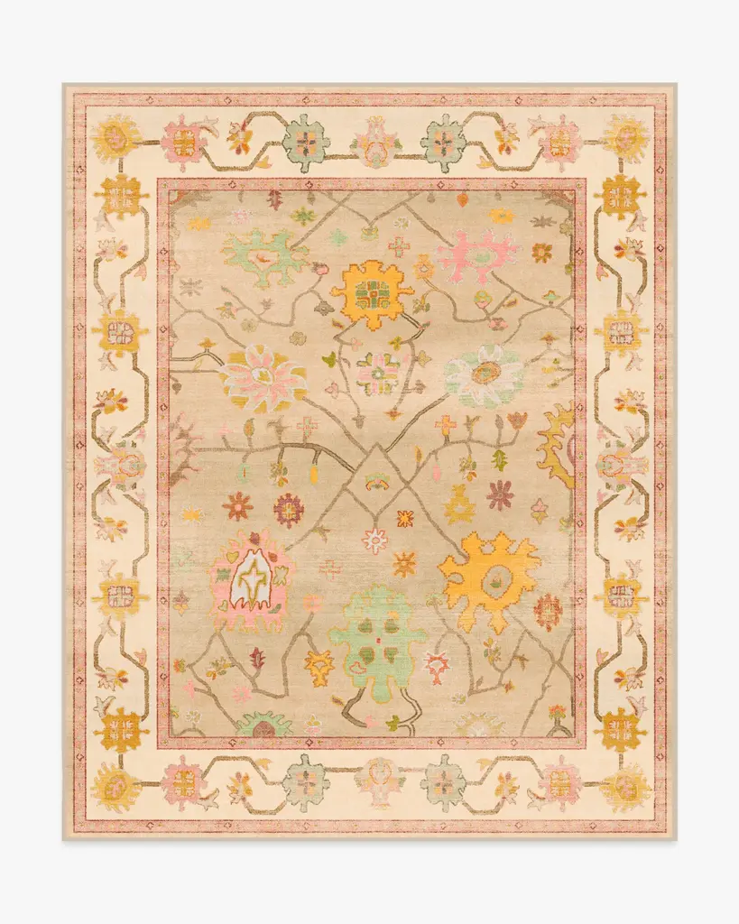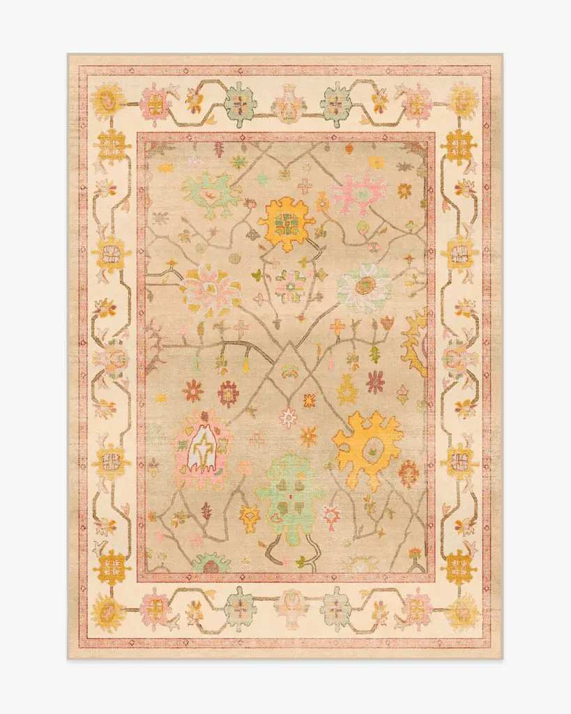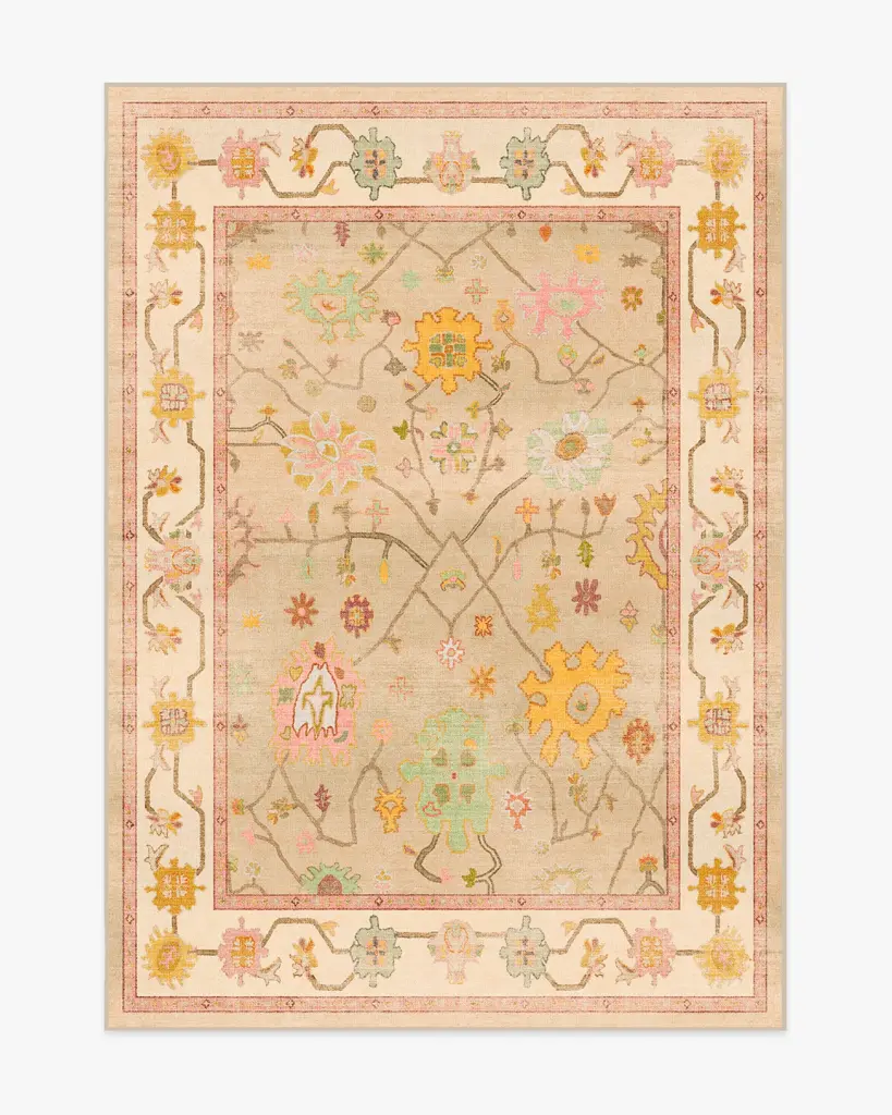 Bring the romance with our Regency-era Jemima Neutral Multicolor Rug. Inspired by timeless Oushak rugs, this opulent design features a playful blend of warm neutrals in the background and border, with accents of mint green, soft pinks, and gold tones. Water-resistant, stain-resistant, and machine-washable. Rug colors may vary slightly according to your device and the lighting in your space.