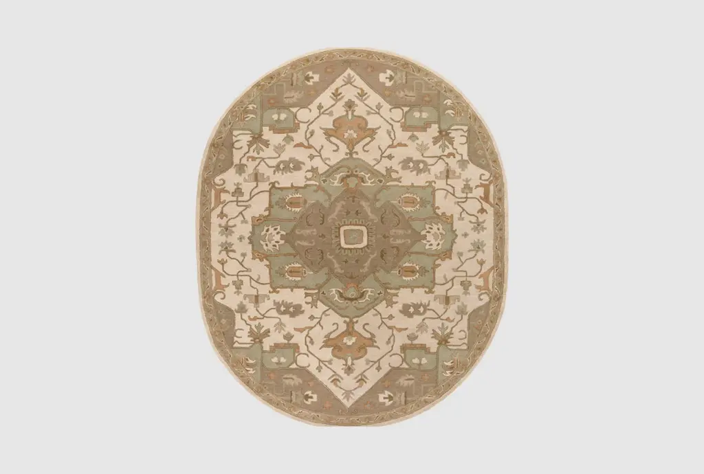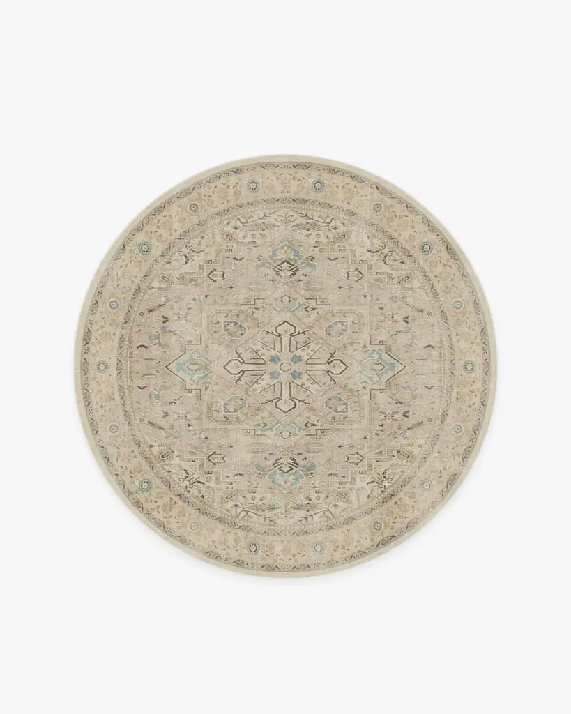 Bring the romance with our Regency-era Jemima Neutral Multicolor Rug. Inspired by timeless Oushak rugs, this opulent design features a playful blend of warm neutrals in the background and border, with accents of mint green, soft pinks, and gold tones. Water-resistant, stain-resistant, and machine-washable. Rug colors may vary slightly according to your device and the lighting in your space.