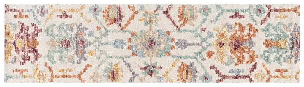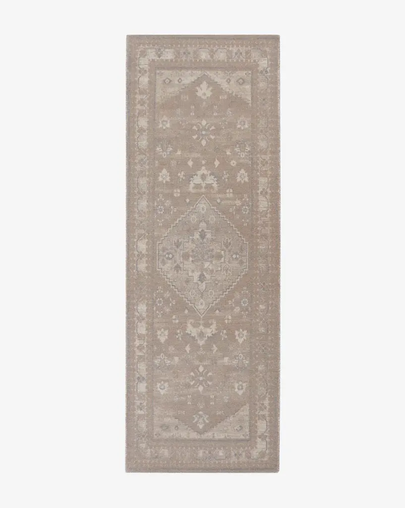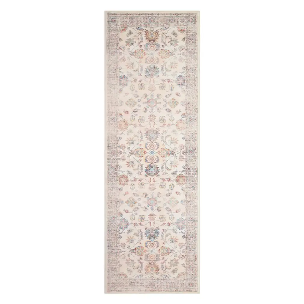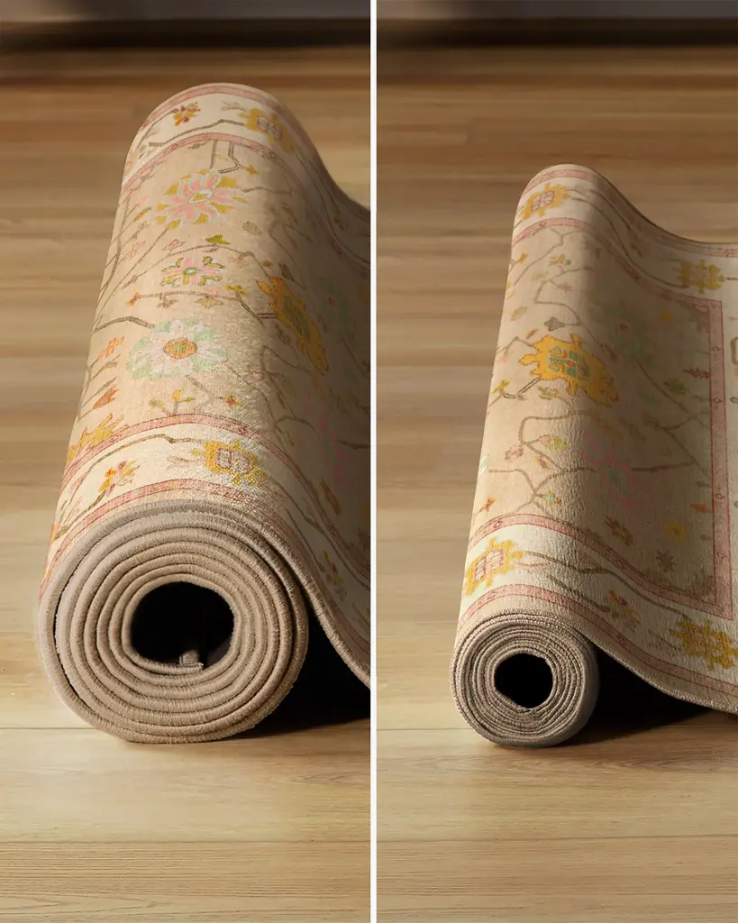 Bring the romance with our Regency-era Jemima Neutral Multicolor Rug. Inspired by timeless Oushak rugs, this opulent design features a playful blend of warm neutrals in the background and border, with accents of mint green, soft pinks, and gold tones. Water-resistant, stain-resistant, and machine-washable. Rug colors may vary slightly according to your device and the lighting in your space.