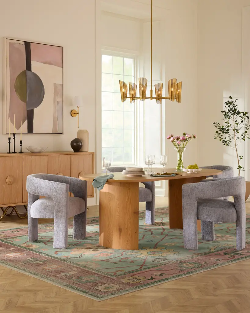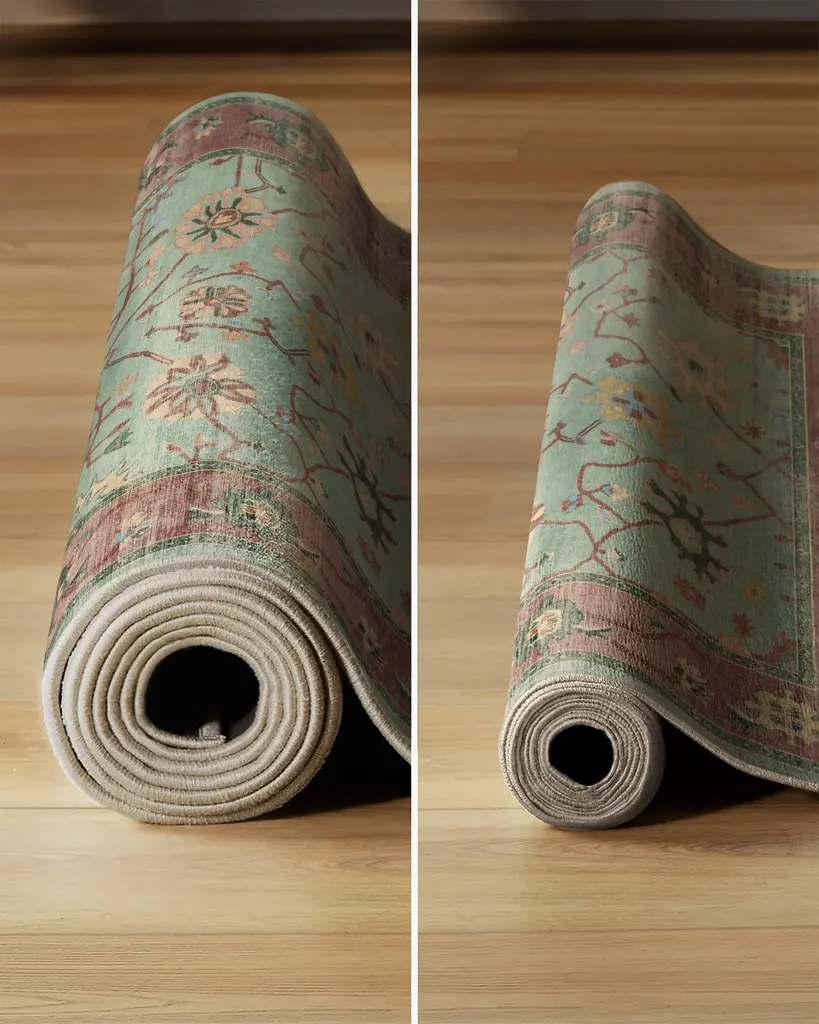 Bring the romance with our Regency-era Jemima Sage and Rosewood Rug. Inspired by timeless Oushak rugs, this opulent design features a soothing sage green background with a rich cherry wood border, accented by light, medium, and dark greens. Water-resistant, stain-resistant, and machine-washable. Rug colors may vary slightly according to your device and the lighting in your space.