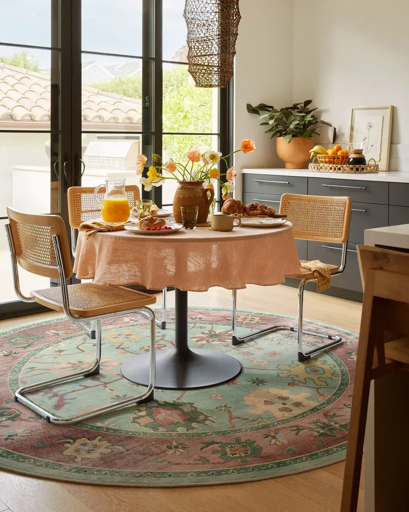 Bring the romance with our Regency-era Jemima Sage and Rosewood Rug. Inspired by timeless Oushak rugs, this opulent design features a soothing sage green background with a rich cherry wood border, accented by light, medium, and dark greens. Water-resistant, stain-resistant, and machine-washable. Rug colors may vary slightly according to your device and the lighting in your space.